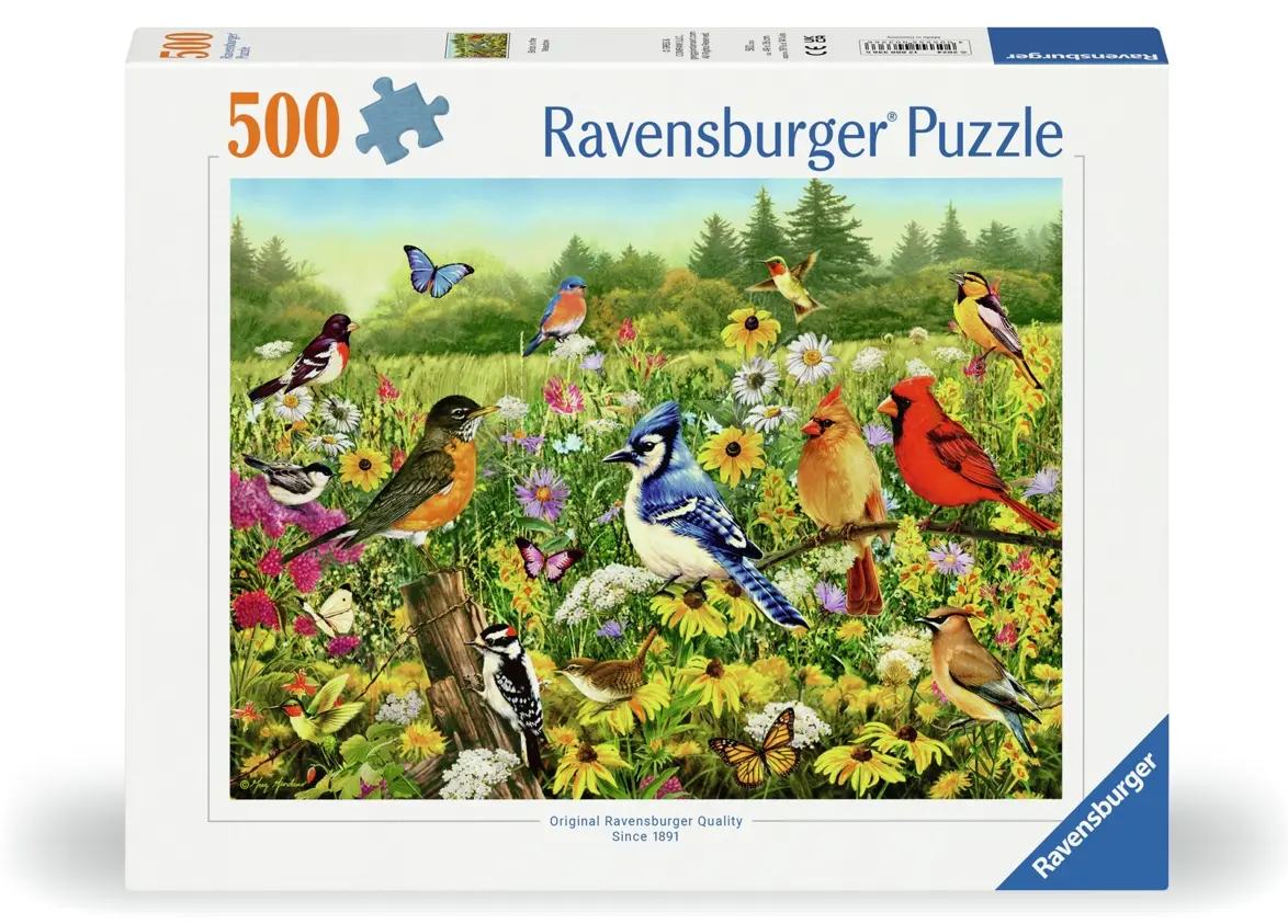 På ett fallfärdigt staket har trädgårdens alla småfåglar samlats. De är omgivna av en färgsprakande blomsteräng och i bakgrunden skymtar skogen. Kan du namnge alla fåglarna?