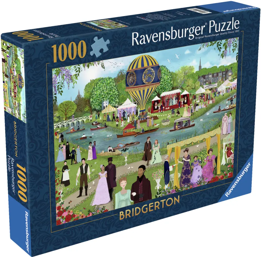 Ett pusselmotiv från TV-serien Bridgerton, i tolkning av den Brittiska illustratören Angela Holland. Vi ser en klassisk scen från stadens stora park, där det är marknad och picknick idag, och dessutom erbjuds man att åka upp i en exotisk luftballong! I parken spatserar kända karaktärer i serien och har intrikata samtal.