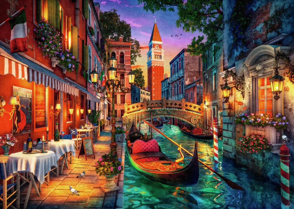 Idylliskt motiv från en av Venedigs många kanaler. De gamla husfasaderna är vackert upplysta i kvällsmörkret, längs kanalen ligger restauranger där borden är dukade med vita dukar, och i kanalen ligger en gondol och väntar på nästa tur.