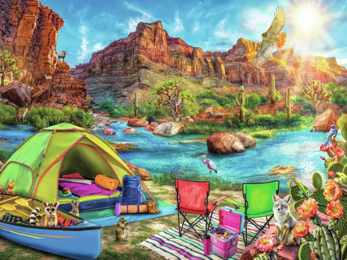 Vid foten av ett mäktigt klipplandskap av röda platåklippor ligger en klarblå sjö. Här har någon slagit läger med sitt gröna tält och en picknick är uppdukad med färggranna fällstolar att sitta på. Inga människor syns till och kanske just därför har landskapets djur passat på att nyfiket smyga sig fram för att ta sig en titt. Här finns tvättbjörnar, harar, prärievargar, örnar, stenbockar och många andra djur. Ett motiv för naturälskare med massor av djur och växter att upptäcka medan du pusslar.