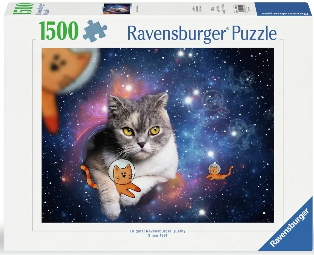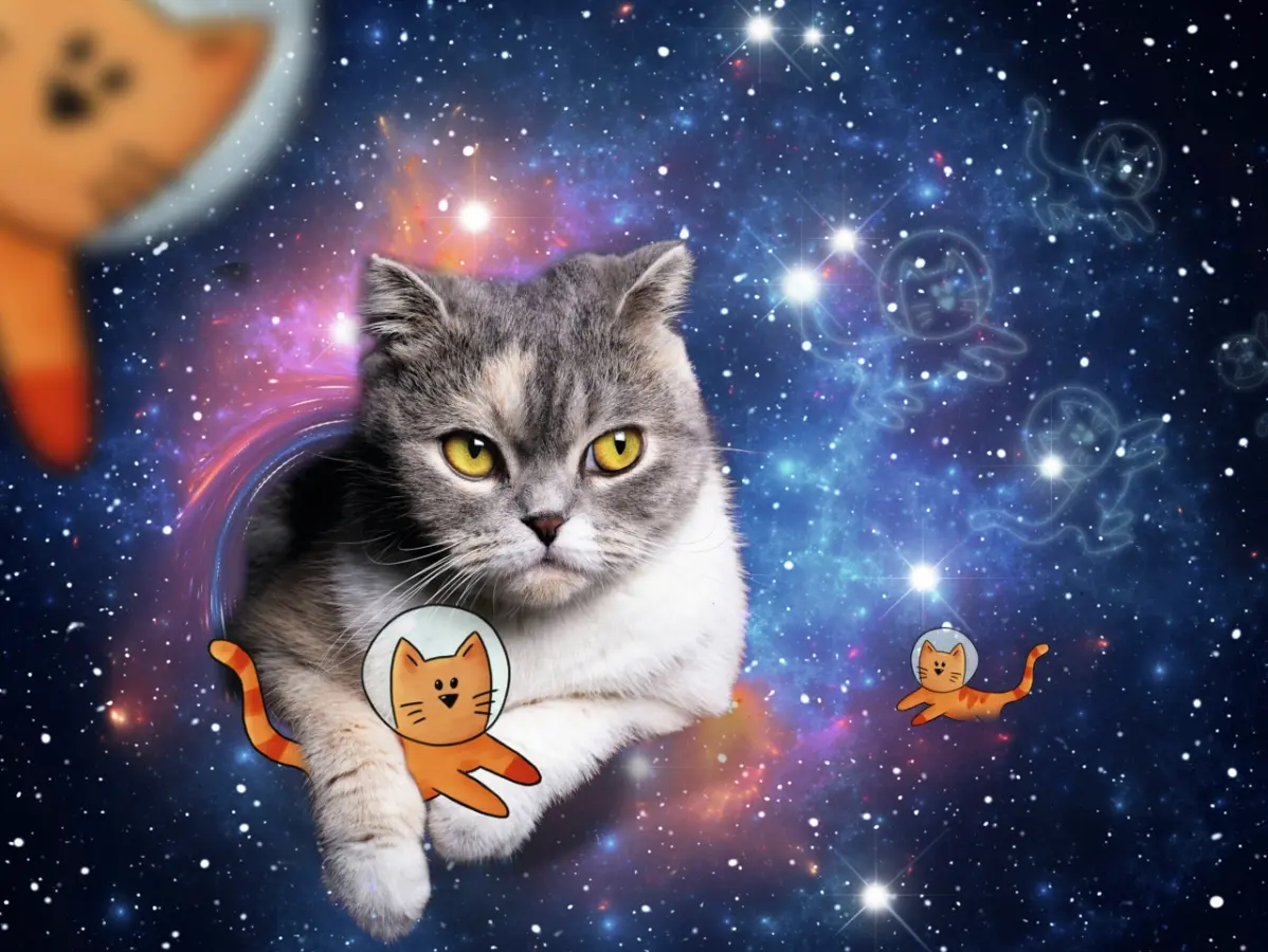 Humoristiskt motiv med en gråmillerad katt som tycks komma ur ett svart hål i rymden. Katten har även tecknade kattvänner omkring sig med astronauthjälmar på sig, och i den stjärnbeströdda galaxen syns även siluetter av astronautkatter.