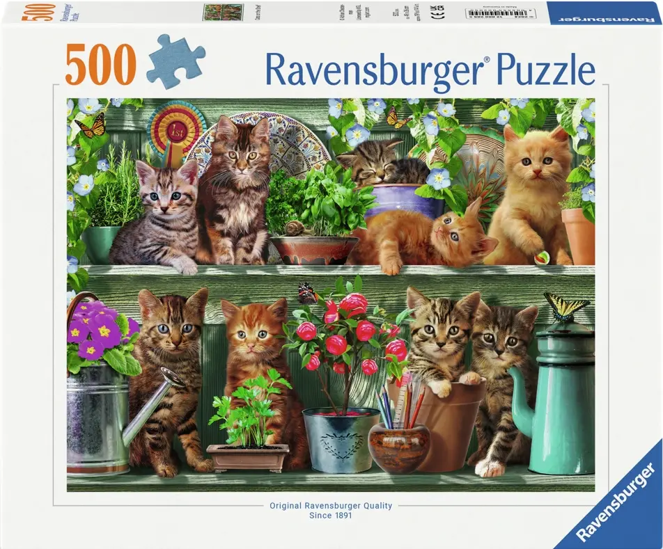 Busiga och söta kattungar har tagit sig upp i hyllan och sitter bland örter och växterna. En av kattungarna har blivit trött mitt i äventyret och passar på att ta sig en liten catnap i en mysig kruka.