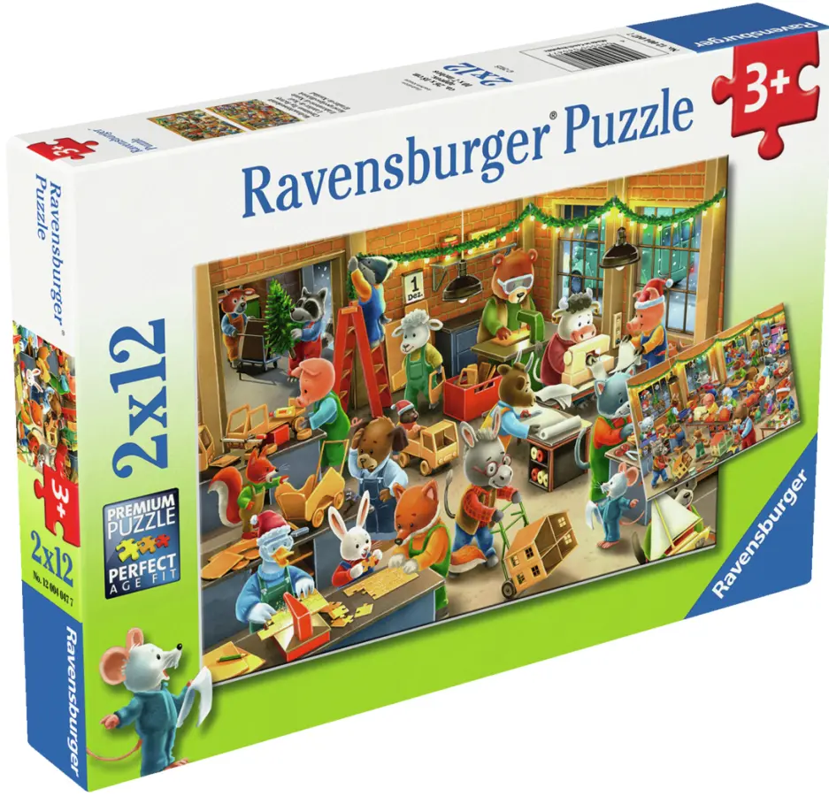 Två pusselmotiv på 12 bitar vardera av en charmig leksaksverkstad i Juletid. I verkstad arbetar djuren med att tillverka leksaker lagom till Jul. Här skapar man dockskåp, bilar, dockvagnar och segelbåtar i trä. En ko syr vita segel till båtarna och en gås, en kanin och en räv hjälps åt att tillverka ett pussel.