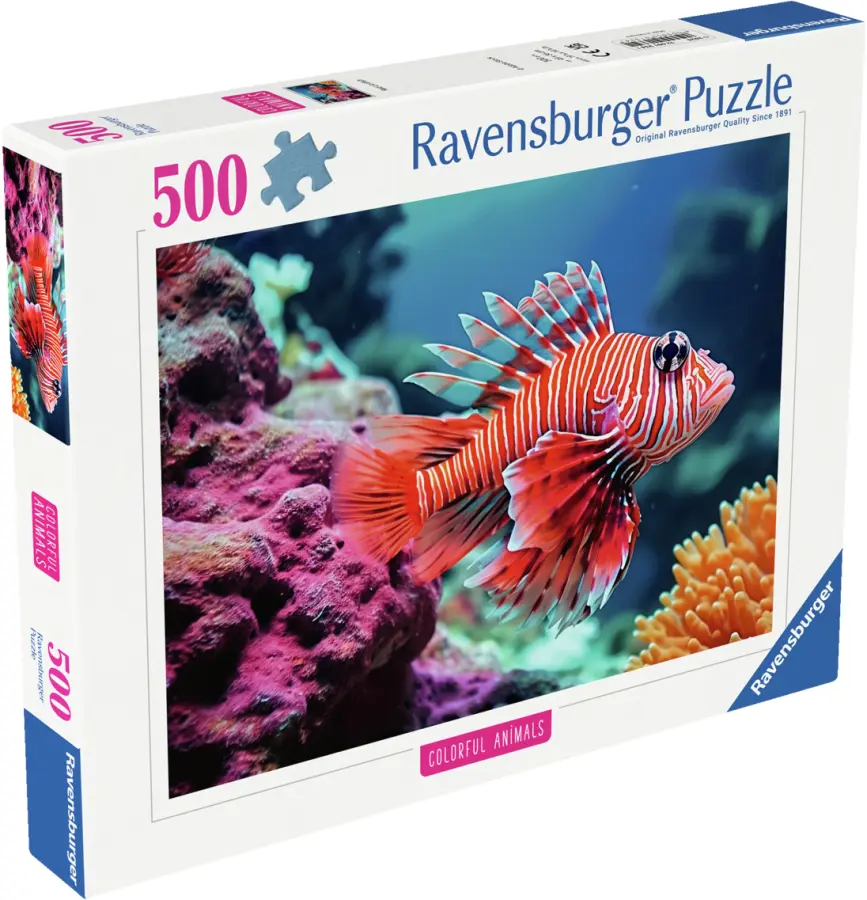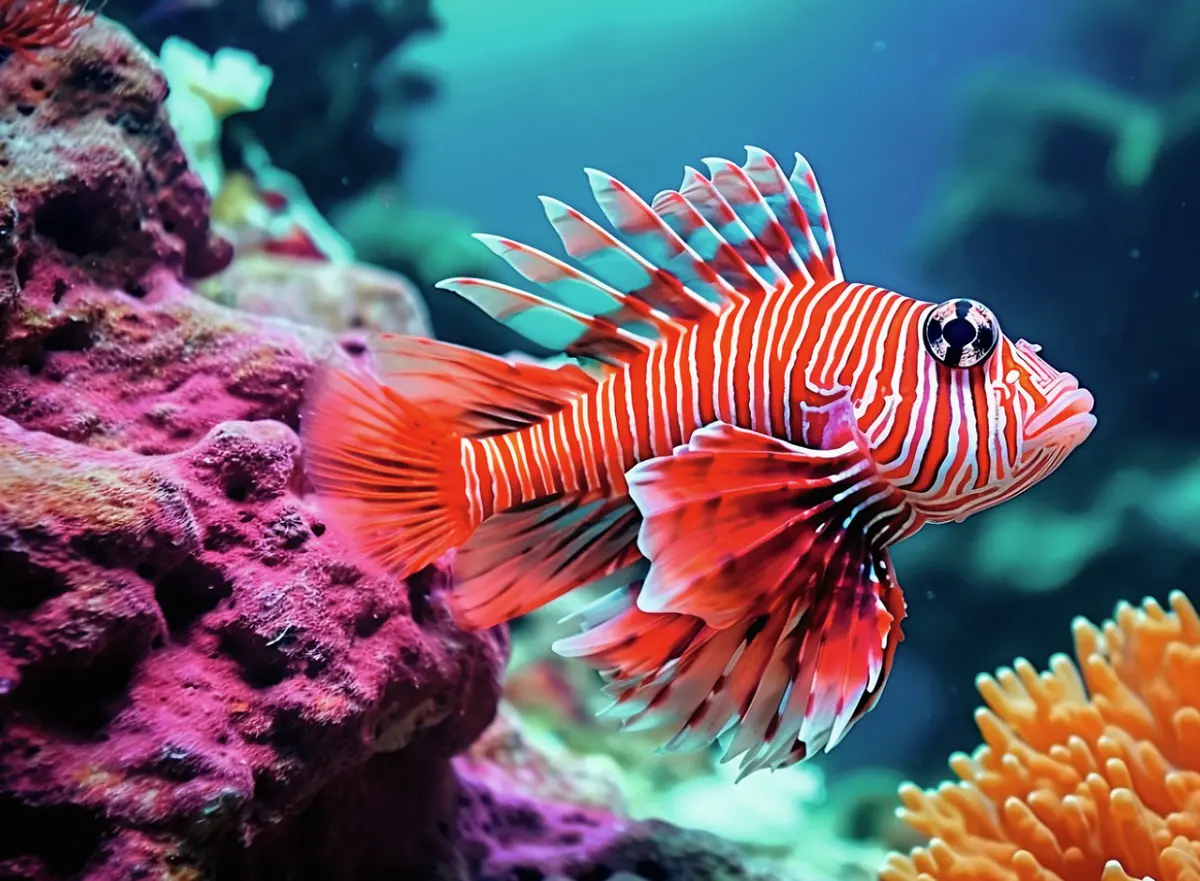 En drakfisk i närbild som simmar i havsgrönt vatten, bland färgstarka koraller.
