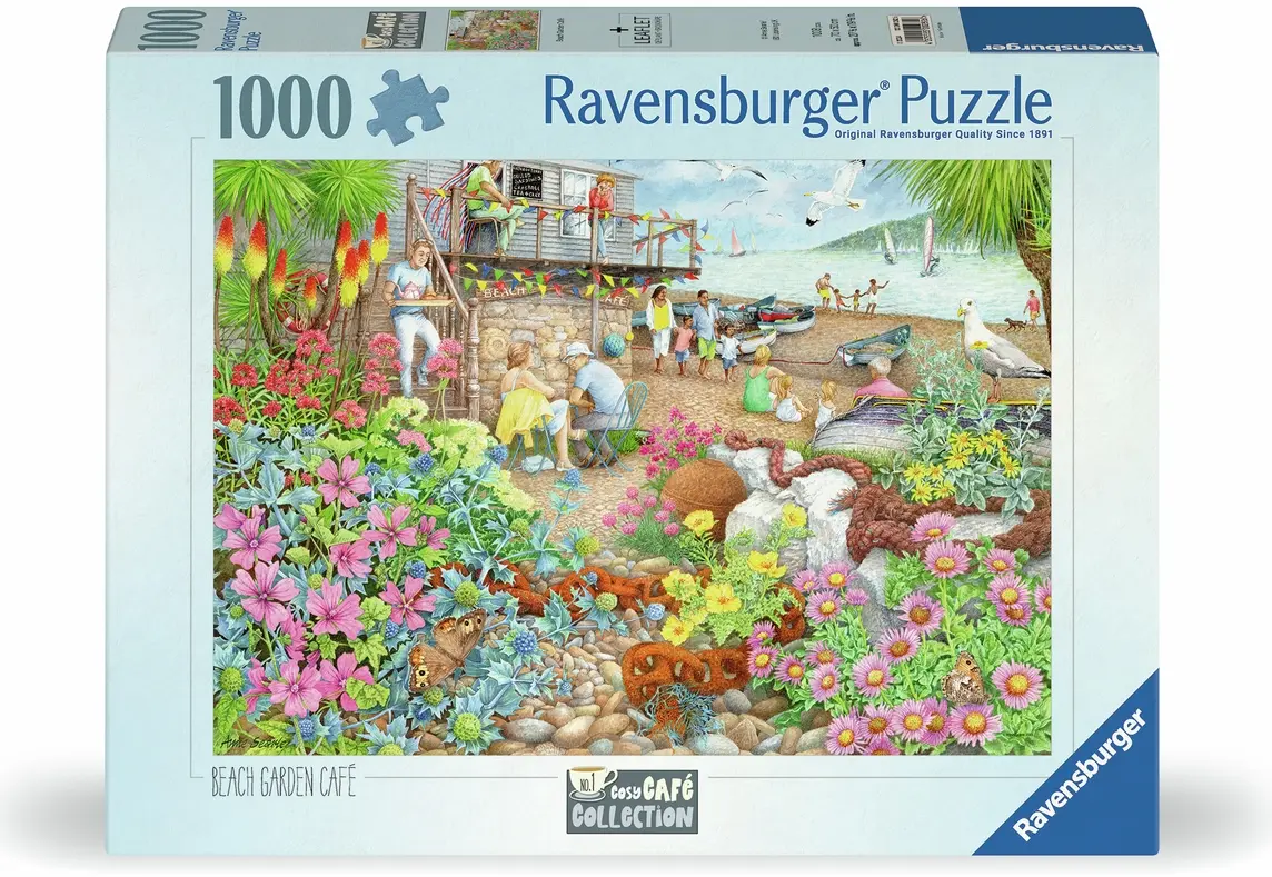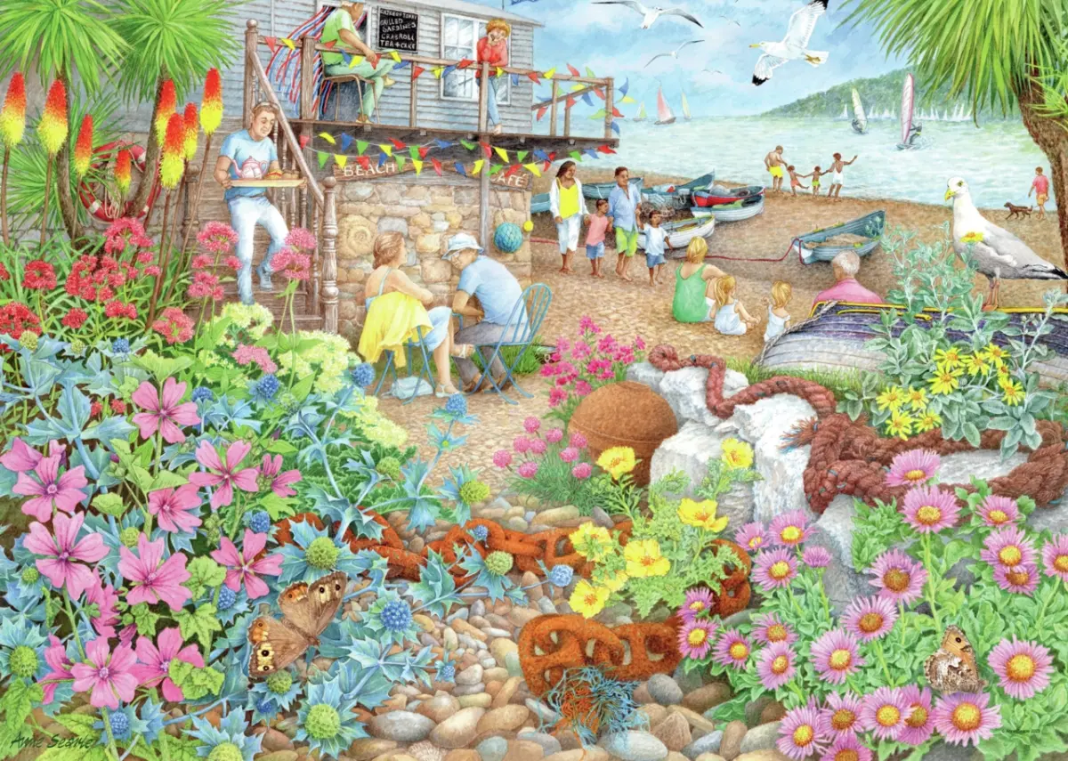 Det är en fin dag på stranden och det lilla strandcaféet är välbesökt. I förgrunden ser vi en trädgård i full blom och längre in i motivet en strand med glada barnfamiljer, hungriga måsar och vilande fiskebåtar. Några är ute och vindsurfar på vågorna och caféets flaggor fladdrar i den svalkande brisen.