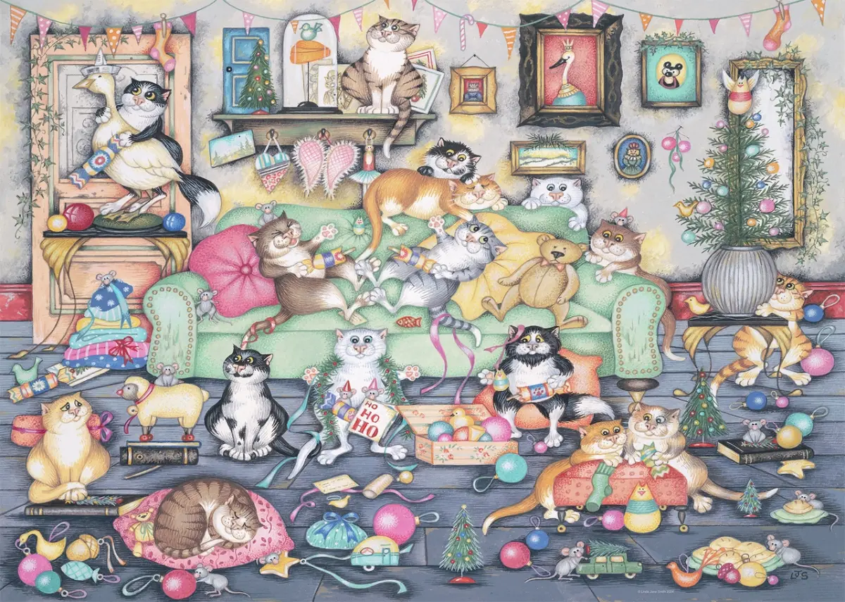 I ett Julpyntat vardagsrum trängs en mängd skojiga katter med roliga karaktärsdrag. Ett detaljrikt motiv i pastellfärger av katt-konstnären Linda Jane Smith. Medan du pusslar kan du också roa dig med att hitta alla små möss som tittar fram här och var, hur många är de egentligen?
