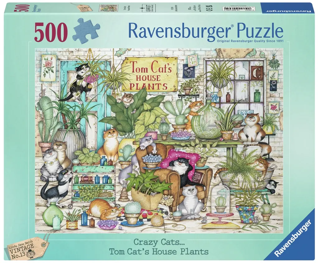Här trängs en mängd skojiga katter med en stor variation av krukväxter. Ett detaljrikt motiv i pastellfärger av katt-konstnären Linda Jane Smith. Medan du pusslar kan du också roa dig med att hitta alla små möss som tittar fram här och var, hur många är de egentligen?