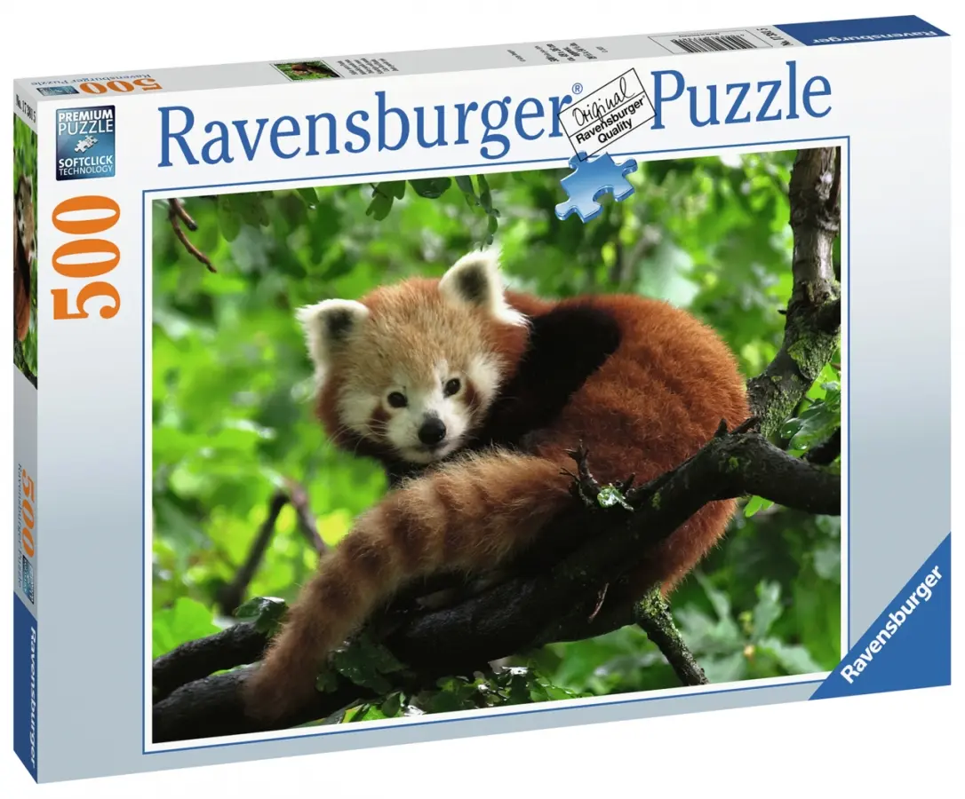 En röd panda tittar stint på dig som pusslar, den har klättrat upp i ett grönskande träd och kanske stör vi mitt i lunchen?!