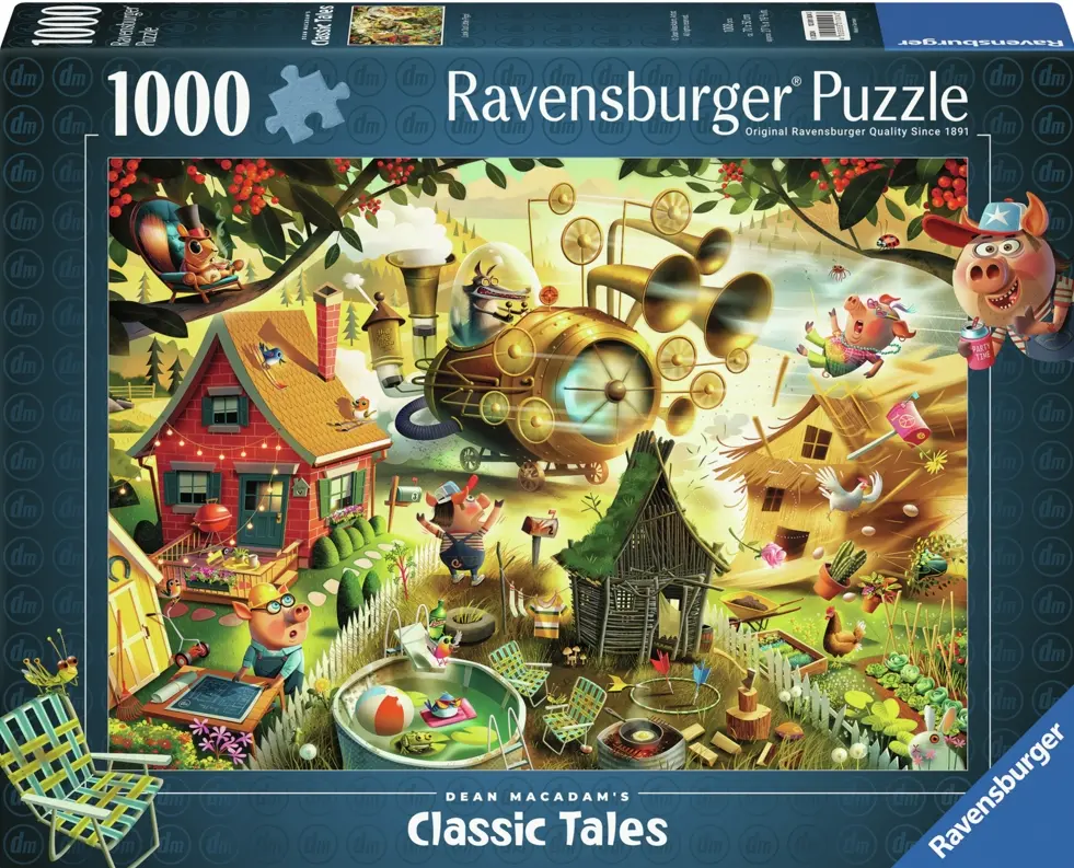Den klassiska barnsagan De tre små grisarna, illustrerad av konstnären Dean MacAdams. I denna fantastiska och fartfyllda tolkning har Vargen tagit hjälp av en enorm guldkromad vindmaskin, och är just i förd med att blåsa sönder den första lilla grisens hus av halm. Grisbrorsorna tittar häpet på medan halmen viner iväg tillsammans med trädgårdens höns, ägg och plantor.