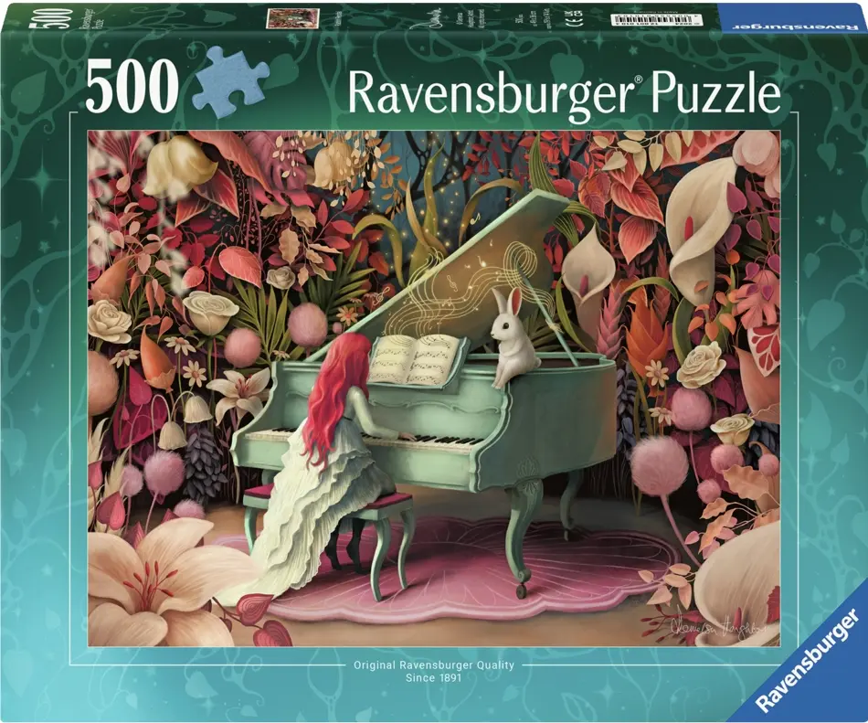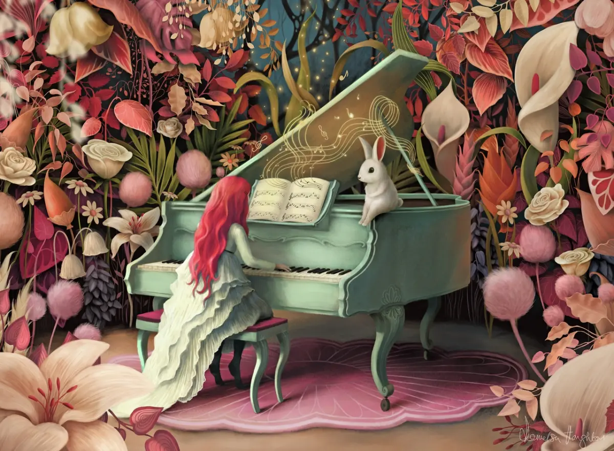Vid en vacker turkos flygel sitter en flicka med långt svallande rött hår, hon spelar för sin vän den vita kaninen och toner i guld strömmar ur flygelns lock. Hon har en svallande klänning och omkring dem trängs mängder av blommor i vitt, lila och rosa.