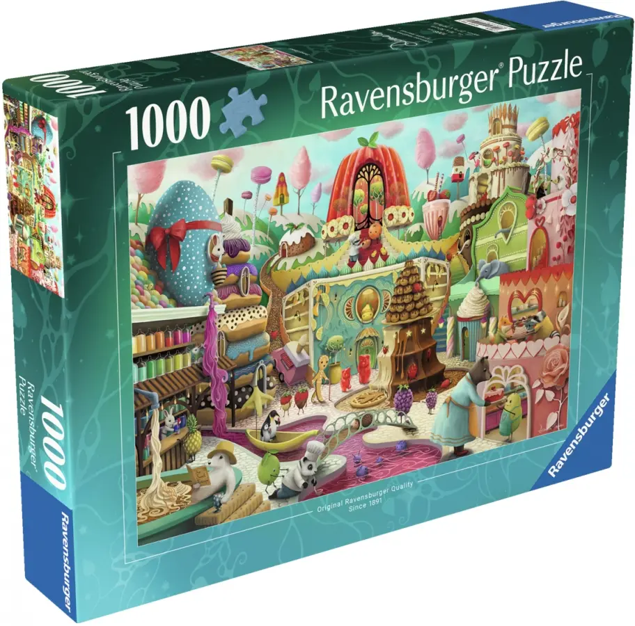 Haughton har återigen skapat en fantastisk värld där byggnaderna är konstruerade av bakverk och godis, och träden toppas med macarons och sockervadd! Här kan glada jordgubbar ta sig ett dopp i saft, en isbjörn badar i choklad och en elefant tar sig en smakbit av taket gjort av grädde.