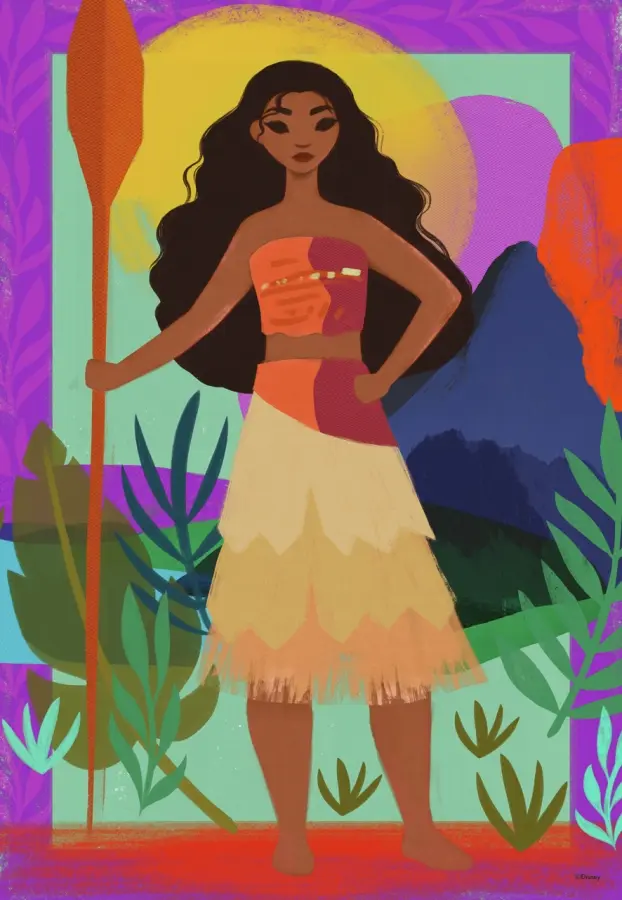 Fira Disneys 100 årsjubileum med ett fint motiv av Vaiana mot en färgsprakande bakgrund.