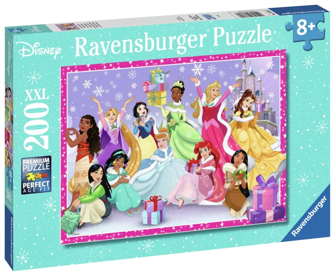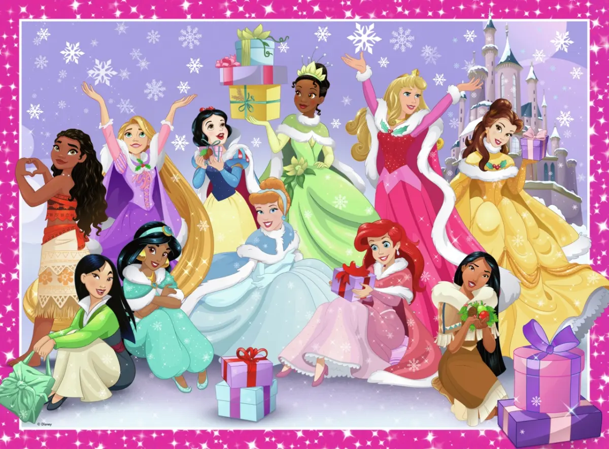 Disneys prinsessor har samlats för att fira in Julen tillsammans och ta en bild framför slottet. Alla är uppklädda, de har paket med sig och snöflingorna dalar ner. Säg omelett!