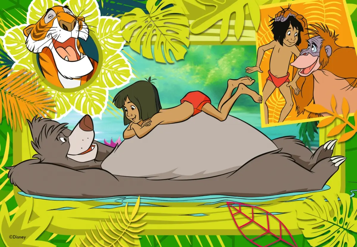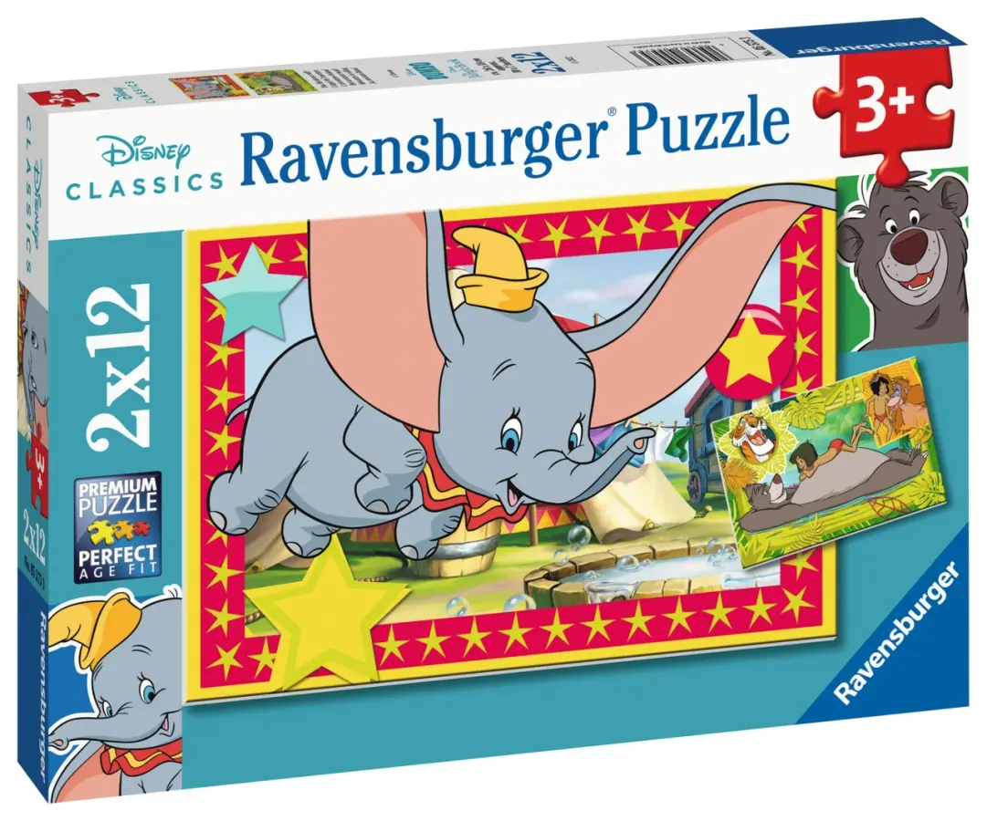 Två pussel på 12 bitar vardera, med motiv från Disneys älskade filmer Dumbo och Djungelboken.