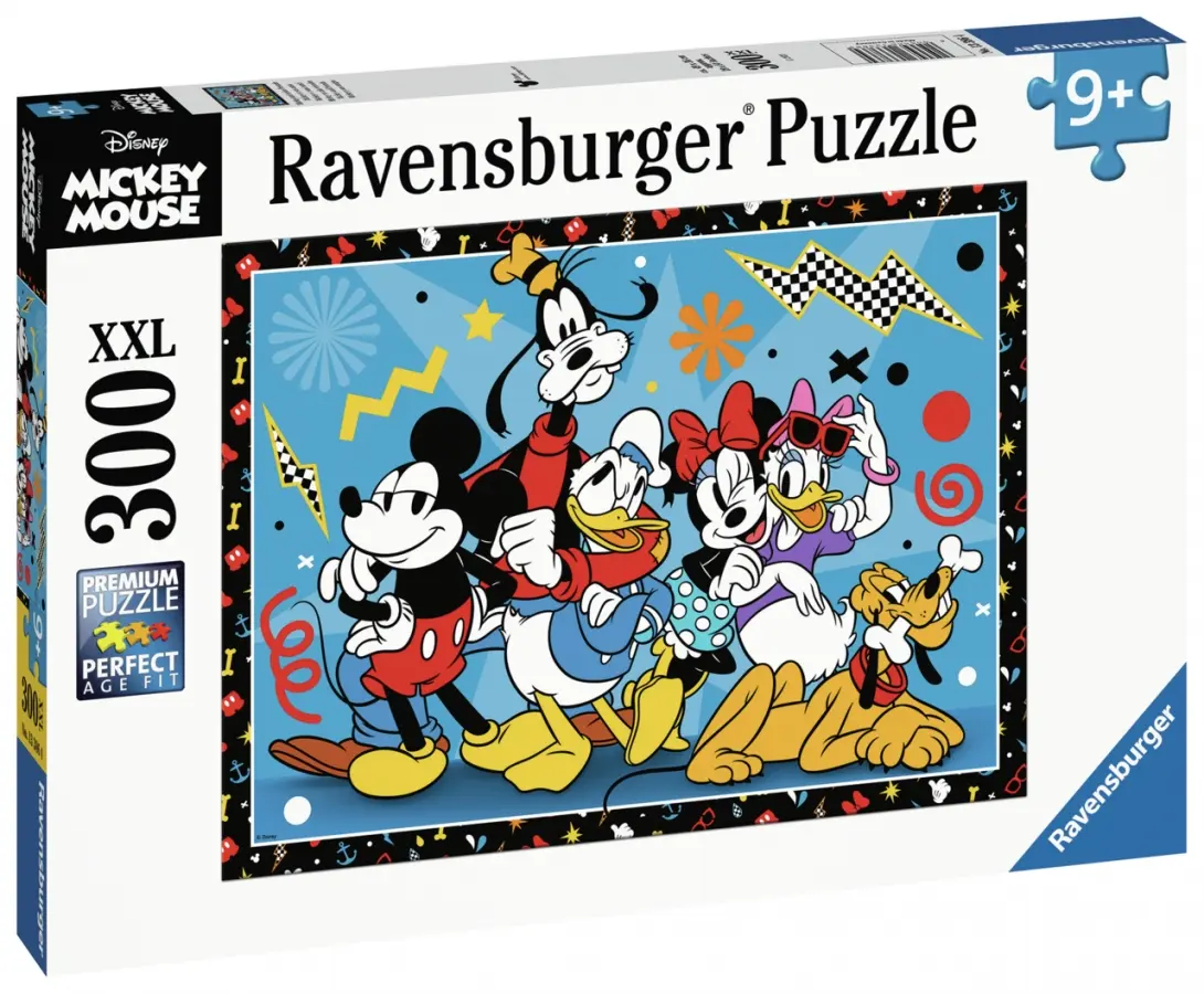 Musse och hans vänner blir fotograferade mot en blå bakgrund full av symboler i olika färger. Pluto är extra nöjd eftersom att han har fått ett stort saftigt ben att gnaga på. Långben busar med Kalle och Mimmi håller om Kajsa.