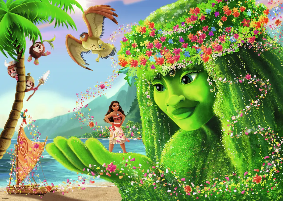 Ett pusselmotiv av mötet mellan Disneykaraktären Vaiana (Moana) och Guden Te Fiti. Te Fiti är en livgivande gudom som skapade öarna i Polynesien, och som enligt sägnen transformeras till den eldiga och destruktiva gestalten Te Kā när hennes hjärta stjäls.