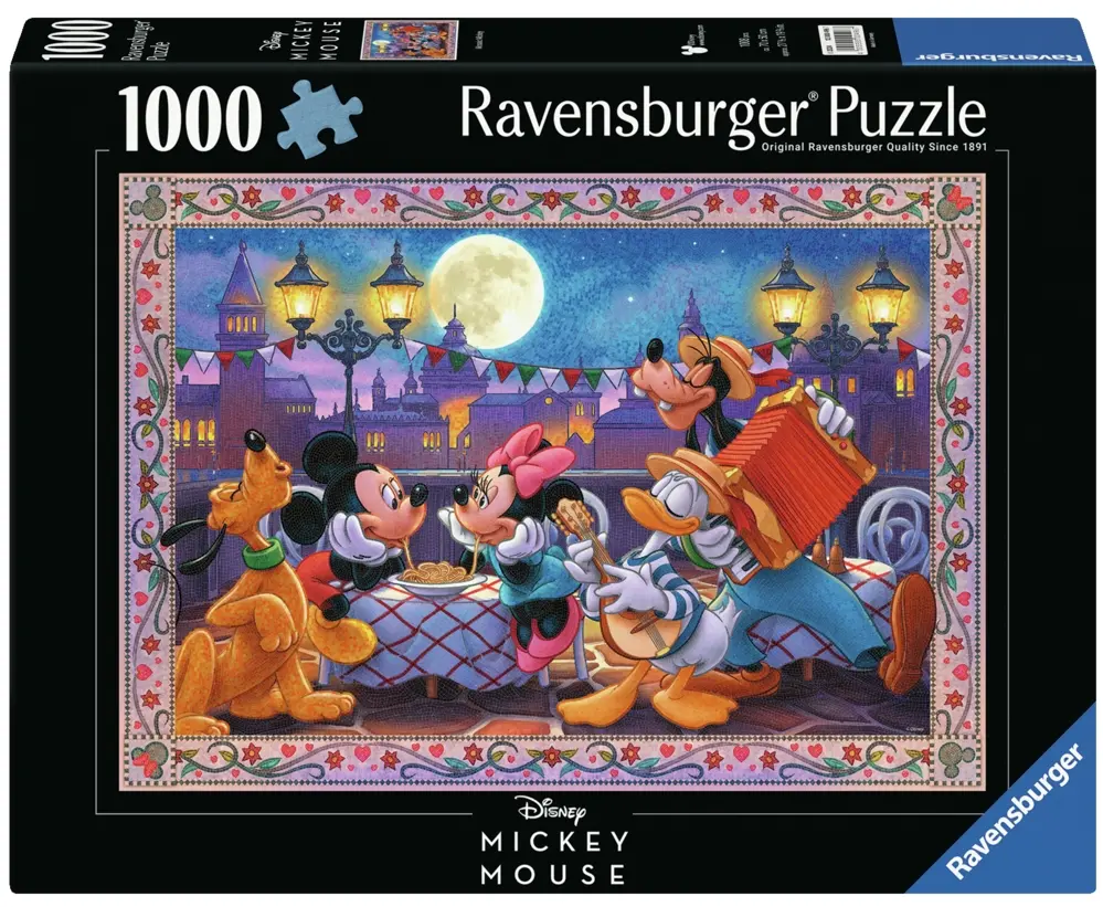 Musse och Mimmi sitter, likt Lady och Lufsen, på en restaurang i Italien. Det är en stjärnklar kväll och Långben, Pluto och Kalle sjunger och spelar "Bella notte....". Fullmånen lyser över paret som just fått fatt i samma spaghetti, ska det bli en kyss?