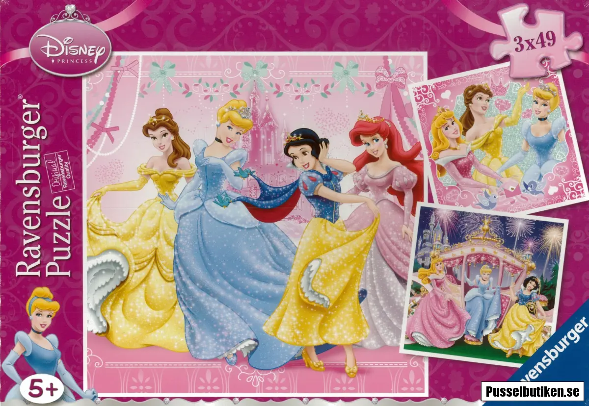 Tre olika pussel med Disneys Snövit, Askungen, Törnrosa, Belle och Ariel.