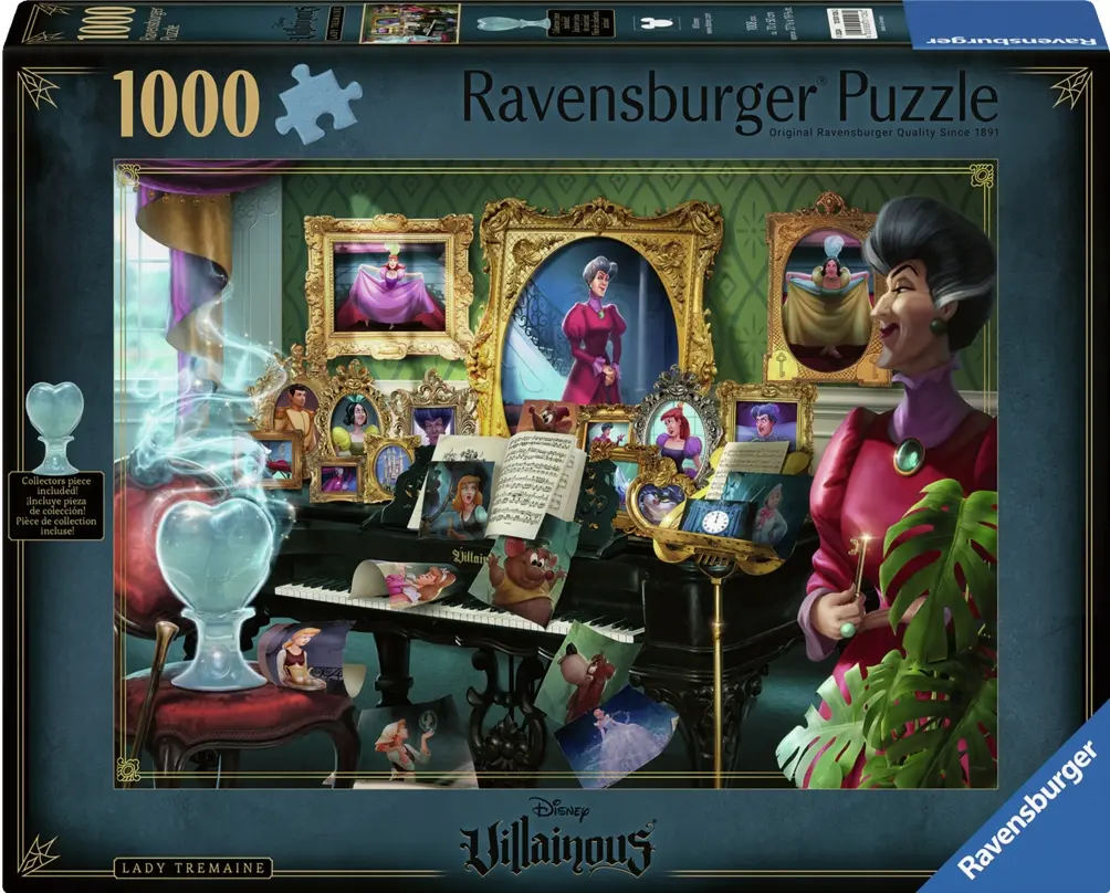 Här porträtteras "Den onda styvmodern" Lady Tremain ur Disneys film Askungen. Hon står med sitt hånfulla flin och blickar ut över en salong med en svart flygel och mängder av bilder och porträtt av filmens karaktärer.