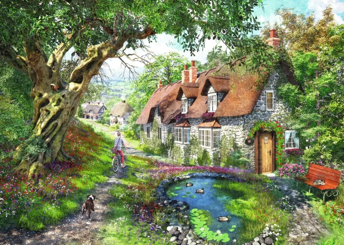 En person cyklar på en landsväg med sin hund glatt springande efter. Längs vägen blommar blommorna och i ett stort träd sitter en liten ekorre och mumsar på något gott. Här finns en damm med änder och längre fram skymtar en pittoresk by med korsvirkeshus och stenhus med tak av vass. Ett harmoniskt solskensmotiv som inbjuder till vila och harmoni av konstnären Dominic Davison.