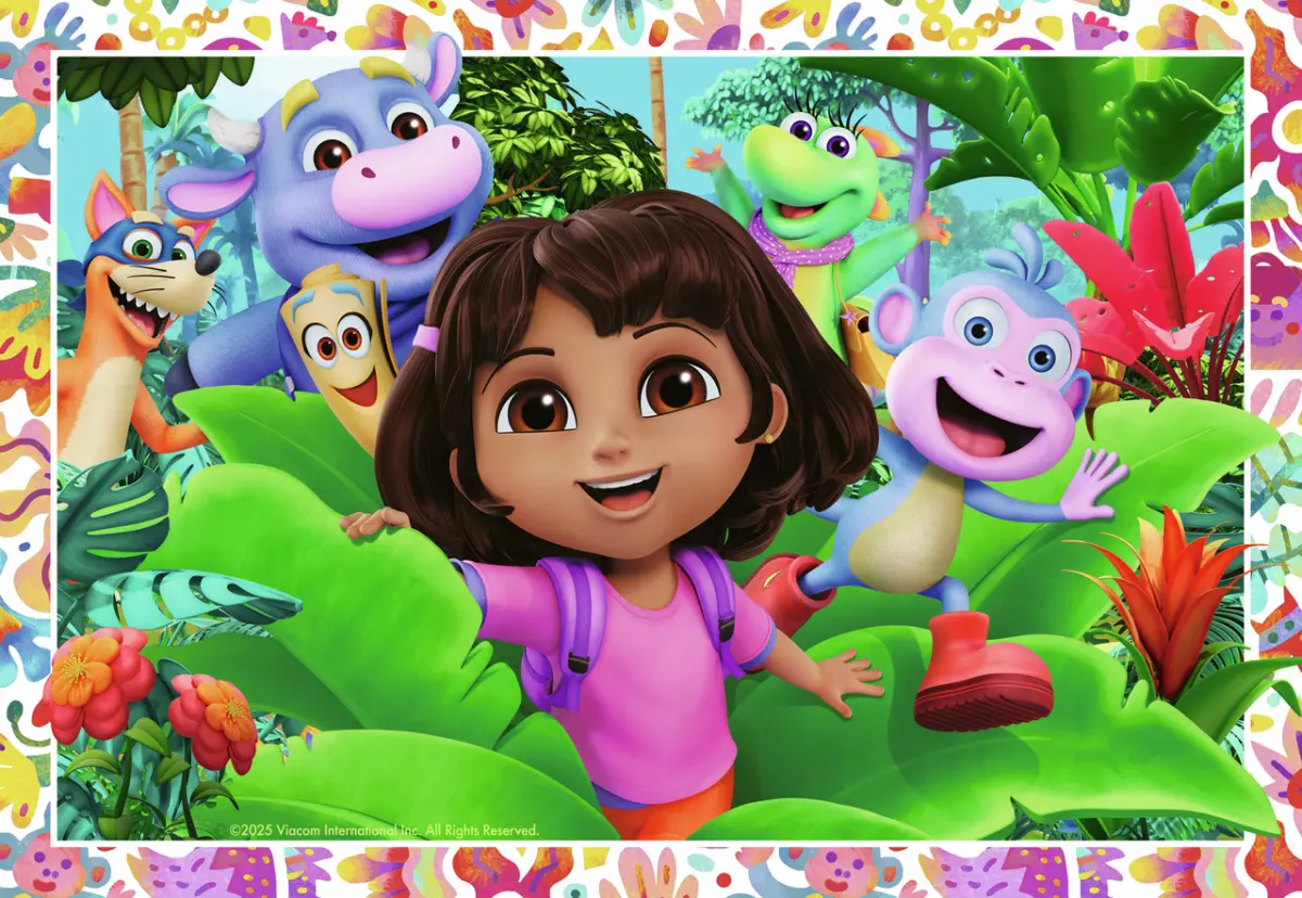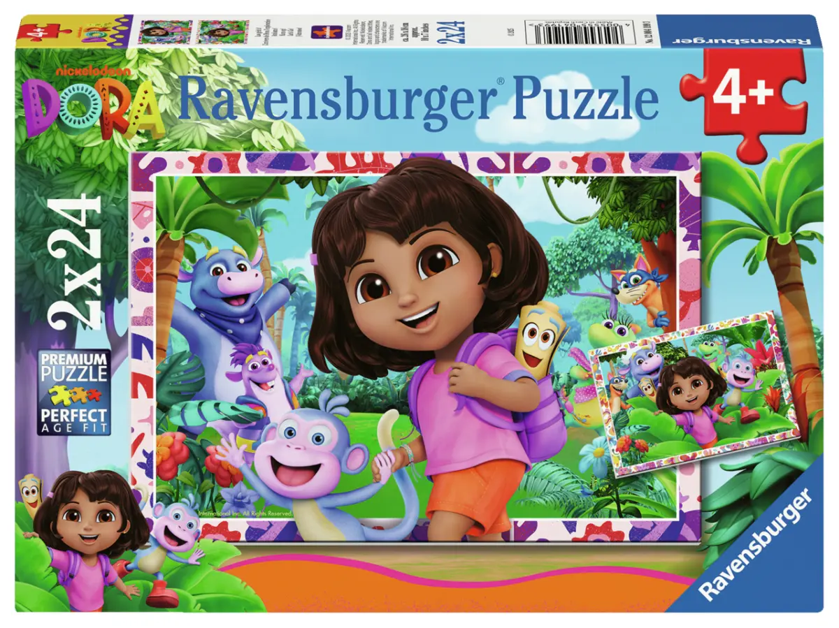 Två pussel på 24 bitar vardera, med olika motiv ur Nickelodeons tecknade serie Dora Utforskaren (Dora the Explorer).