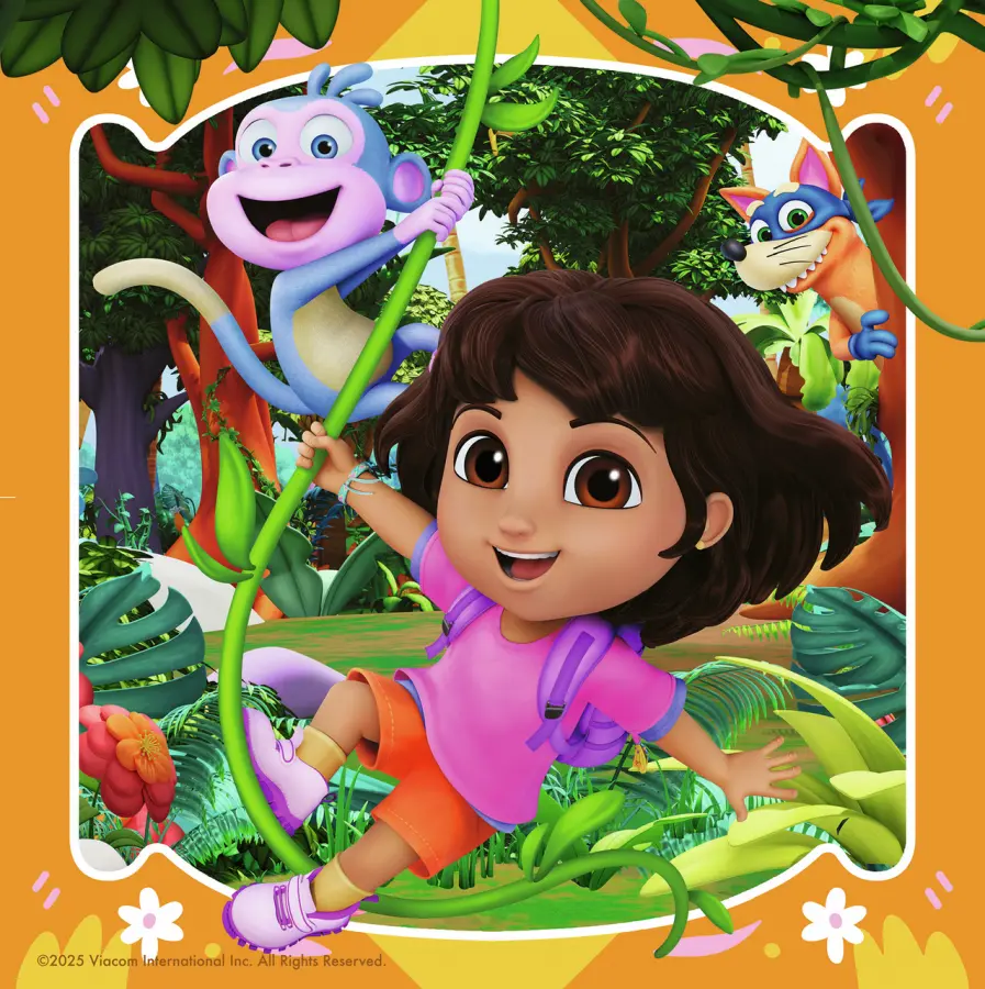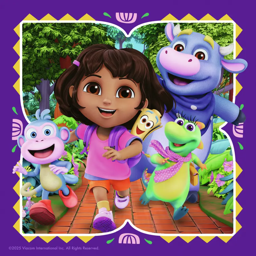 Tre pussel på 49 bitar vardera, med olika motiv ur Nickelodeons tecknade serie Dora Utforskaren (Dora the Explorer).