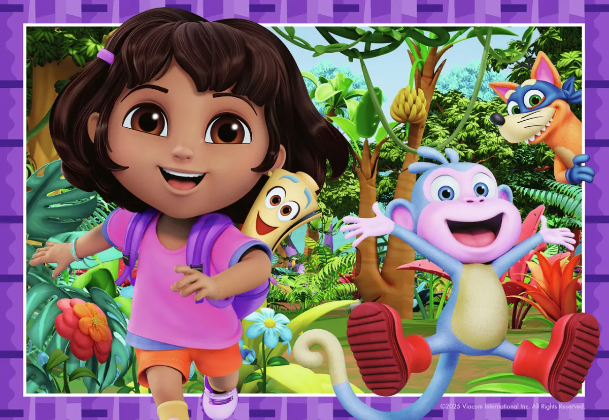 Två pussel på 12 bitar vardera, med olika motiv ur Nickelodeons tecknade serie Dora Utforskaren (Dora the Explorer).
