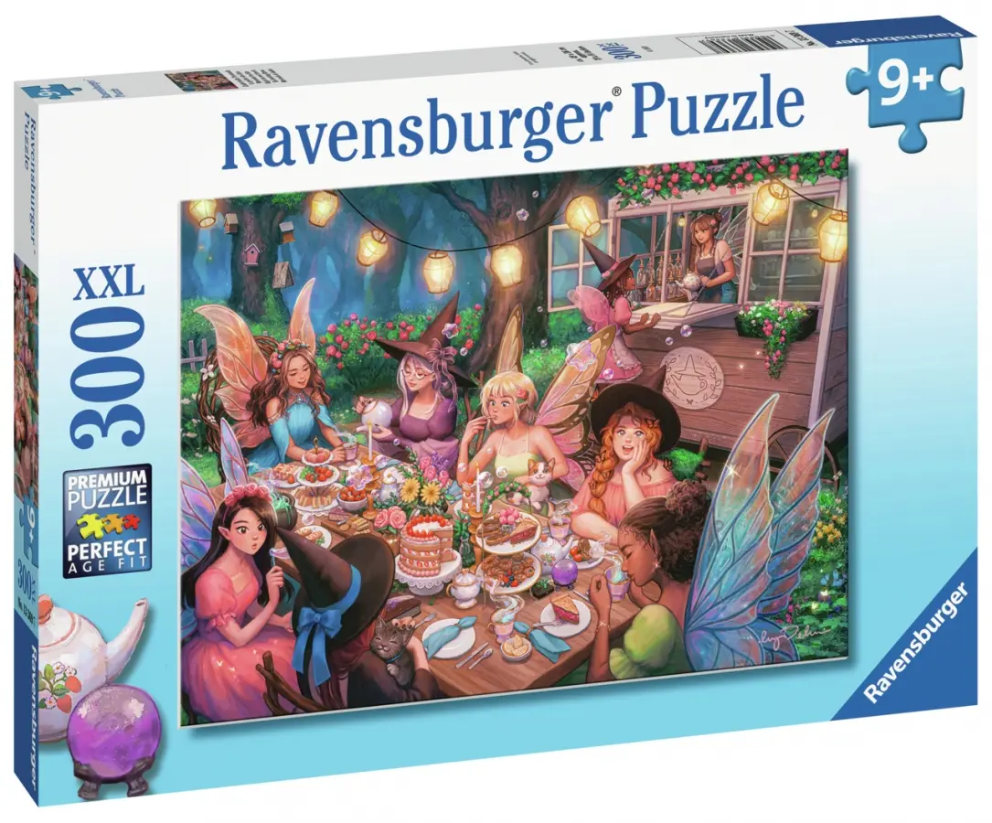 En grupp älvor och häxor har samlats för en gemensam afternoon tea i den magiska skogen. Tillsammans sitter de vid ett stort träbord fullt av läckerheter. Men är det verkligen te som serveras i den vackra teservisen? Kanske har det här skogscaféet en magisk rykande dryck att bjuda på!