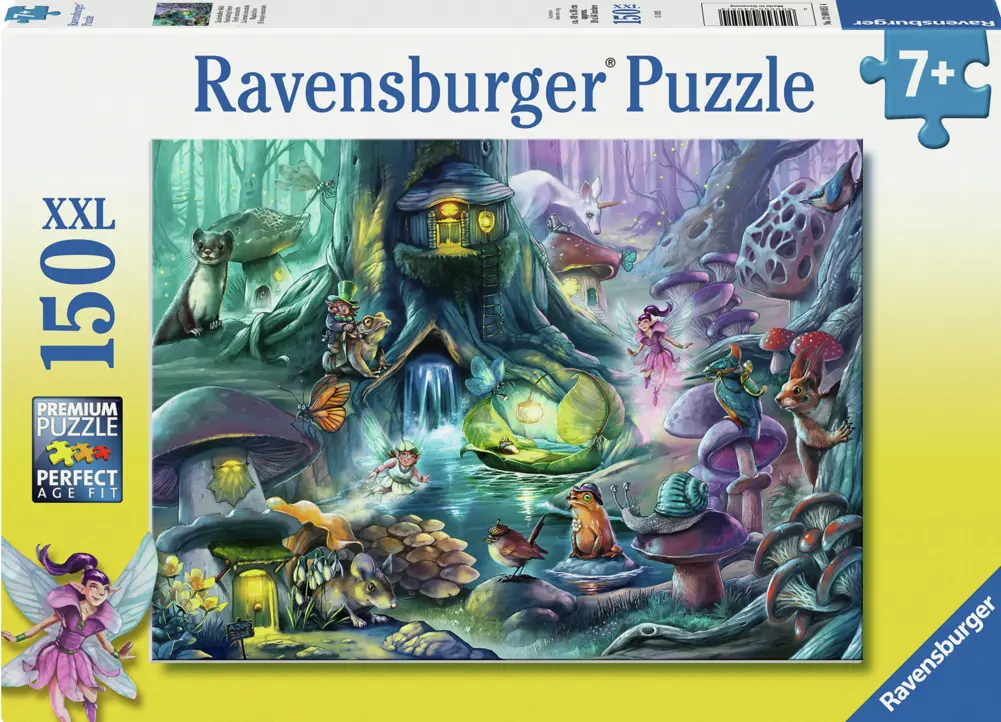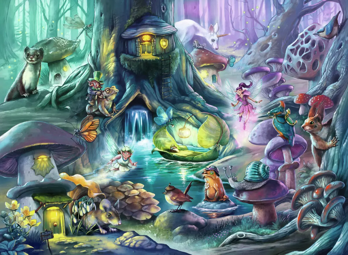 I trädälvornas stad bor djur och älvor sida vid sida. Flera av vännerna har samlats vid vattnet där ett vattenfall porlar fram och en båt av blad ligger och guppar, i aktern har den en vacker lykta som lyser upp i mörkret. Ett magiskt motiv för alla som tycker om förtrollande sagoväsen och naturen!