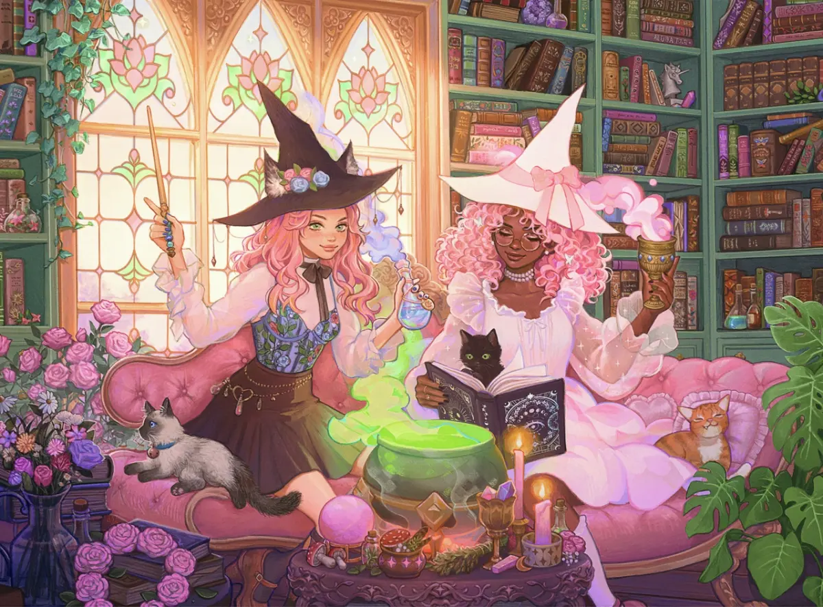Två häxor i vackra klänningar och matchande häxhattar har slagit sig ner i ett bibliotek. De läser ur en bok och samtidigt lagar de rykande häxbrygder. Några katter gör dem sällskap i den rosa sammetssoffan och i bakgrunden syns böcker med fina bokpärmar, blommor och ett dekorerat glasfönster där ljuset kan flöda in.