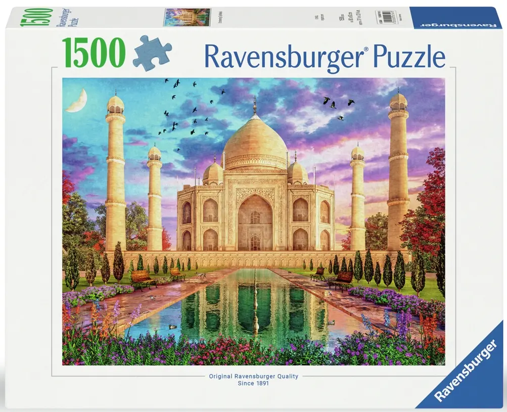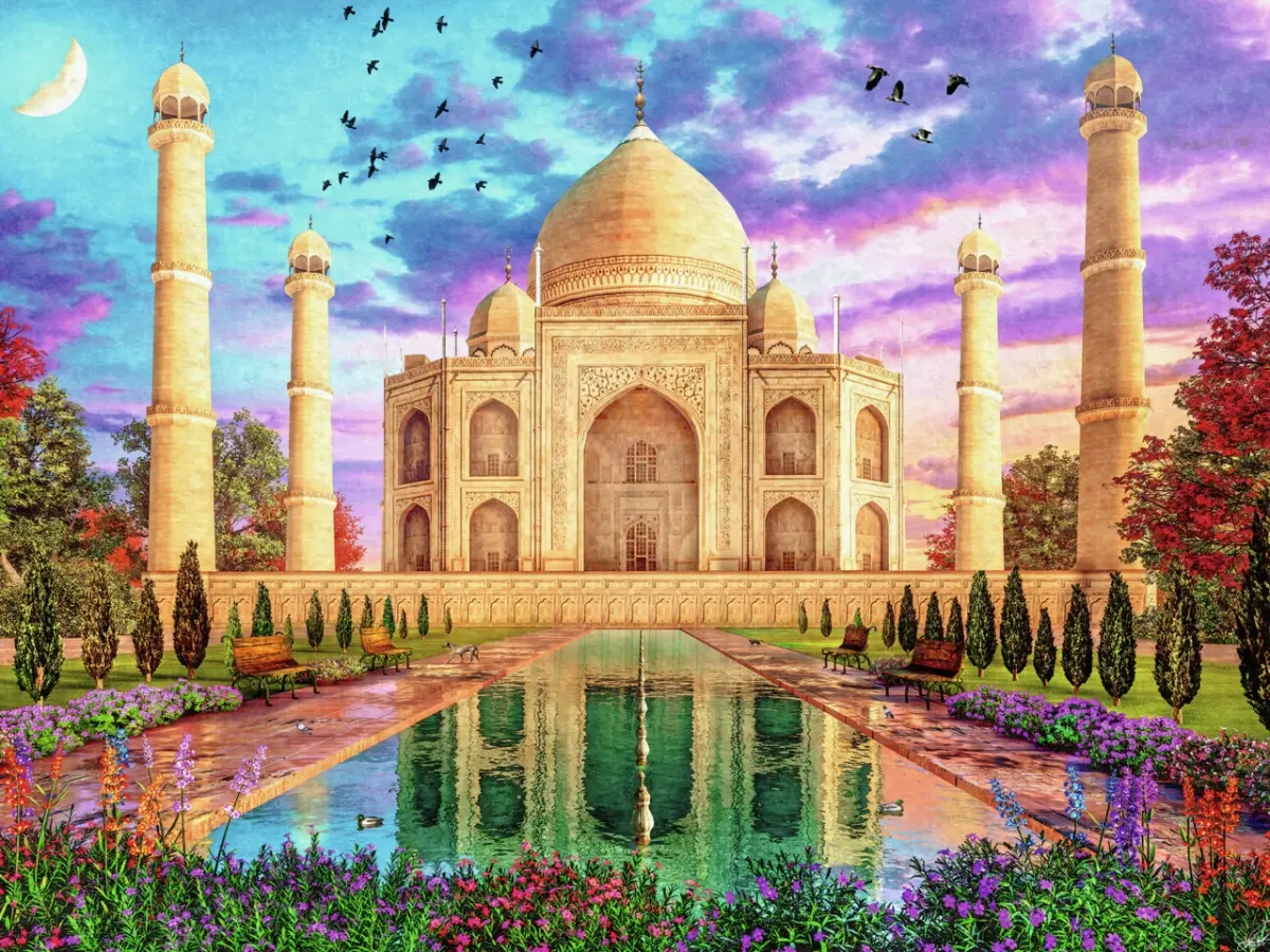 Motiv av det världskända Taj Mahal med dess karakteristiska trädgård och en spegeldamm som leder upp mot byggnaden. Ett rosa skimmer lyser i motivet och himlen går i blått, lila och rosa. En flock fåglar flyger över trädgården och på himlen lyser en månskära.