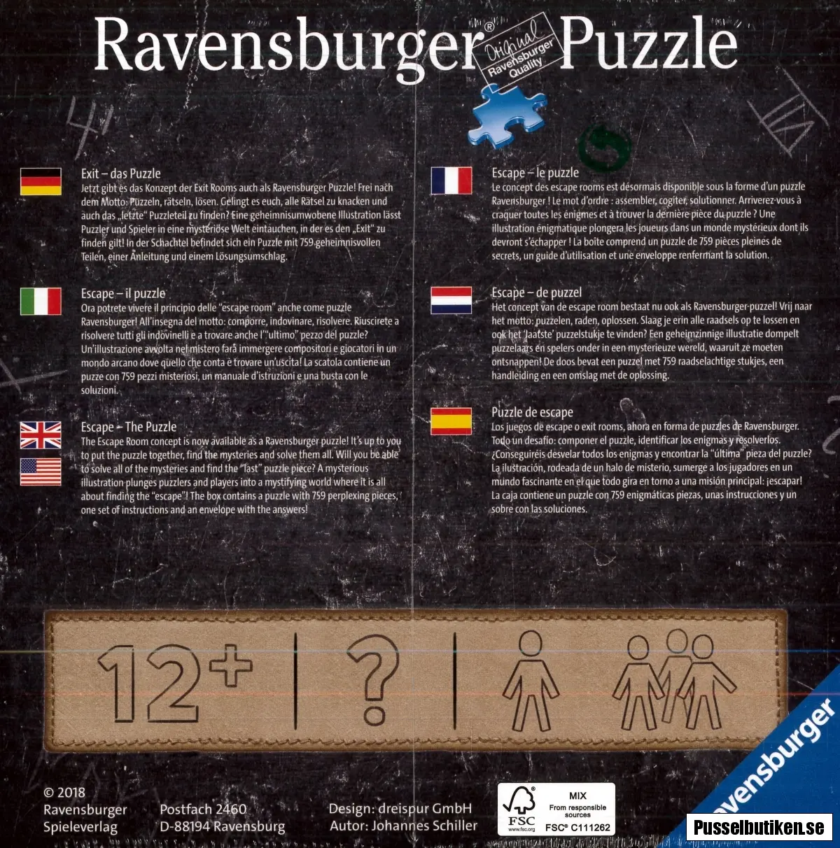 Pusselkartongen innehåller ett pussel på 759 bitar, en instruktion på engelska, och ett kuvert med den rätta lösningen. Pusslen lämpar sig för vuxna men passar alla åldrar från 12 år och uppåt. En rolig utmaning för dig själv som gillar att pussla eller något spännande att ha framme när du får vännerna på besök.