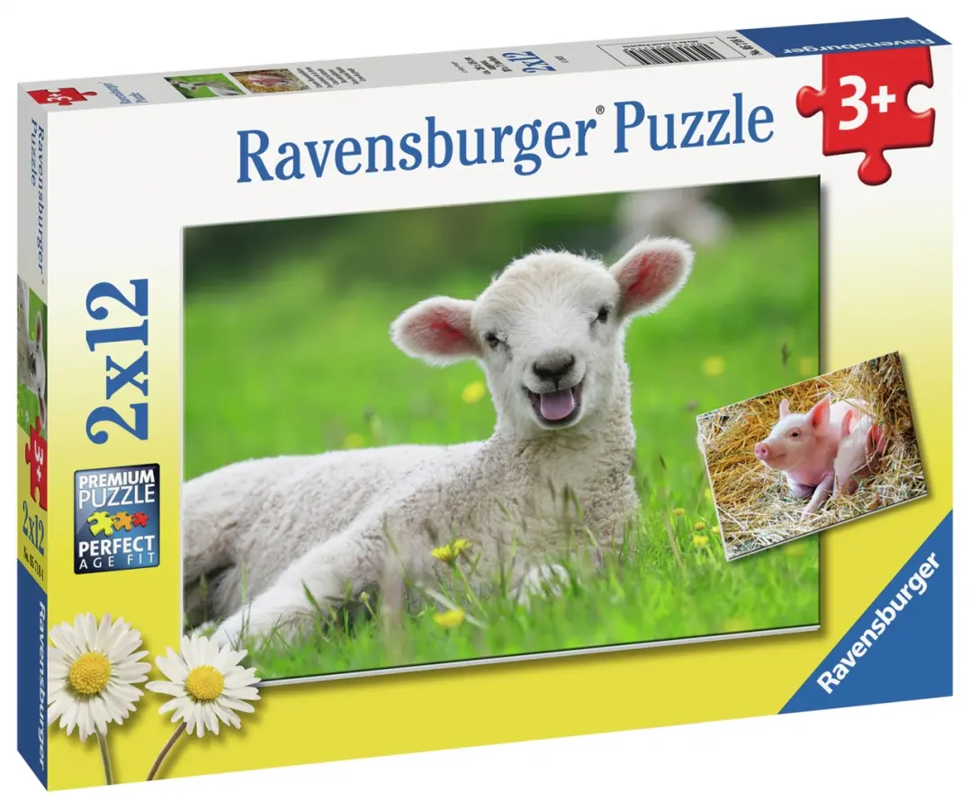 Två pussel på 12 bitar vardera. I det ena pusslet ligger ett vitt litet lamm och vilar sig i det gröna gräset omgiven av maskrosor. I det andra motivet får vi träffa två söta kultingar som håller varandra sällskap i halmen.