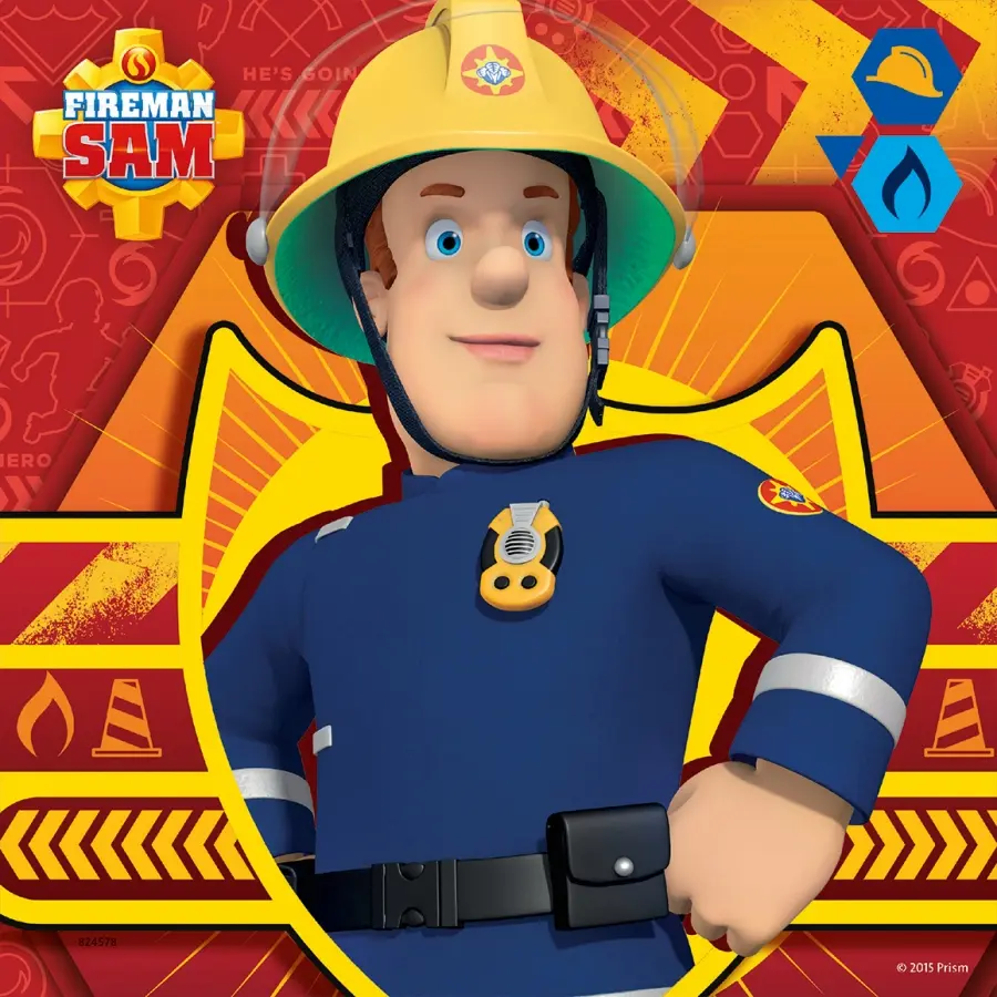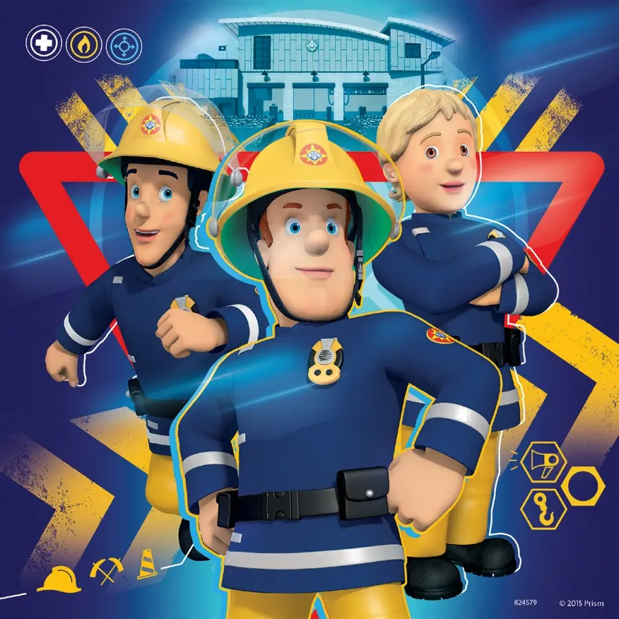 Tre pussel med olika motiv från Fireman Sam. Varje pussel består av 49 bitar. Pusselbitarna är större än traditionella pusselbitar för att förenkla pusslandet.