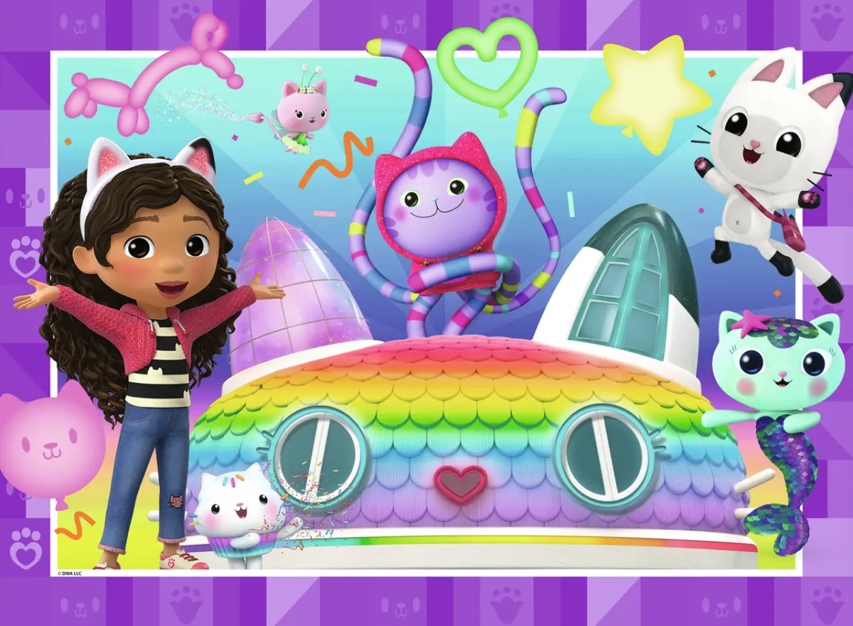 Gabby och hennes vänner i Tv-serien Gabbys Dockskåp! idag har de samlats för fest i det regnbågsfärgade katthuset, alla vänner är samlade och ballongerna är uppblåsta, festen kan börja!