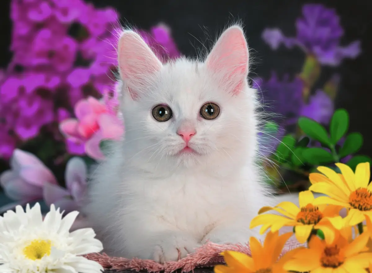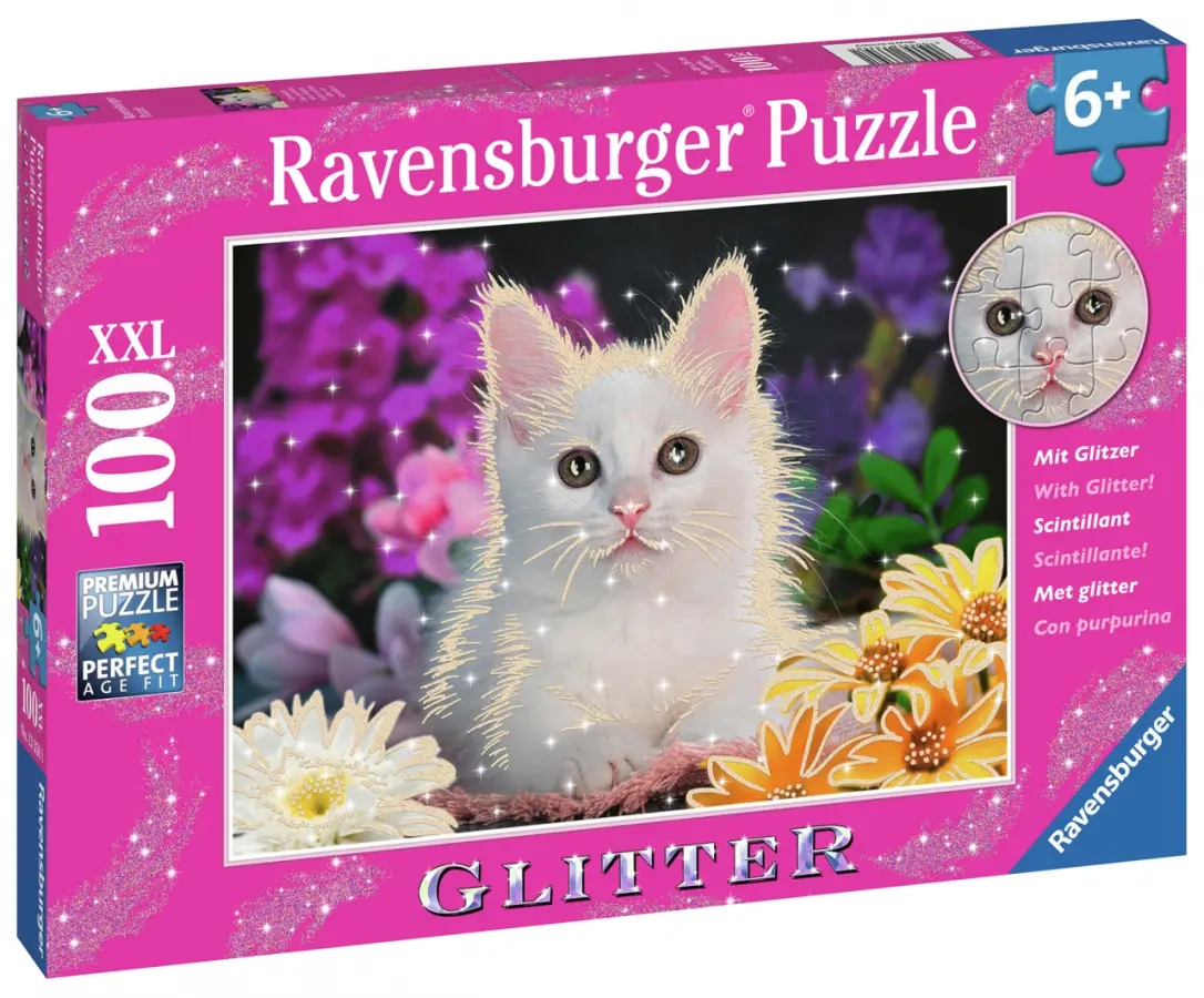 En vit katt sticker upp huvudet bland några blommor i gult och vitt. Bakom skymtar fler blommor i rosa och lila toner som glimmar. Pusslet har glittereffekt med konturer som glimmar i guld.