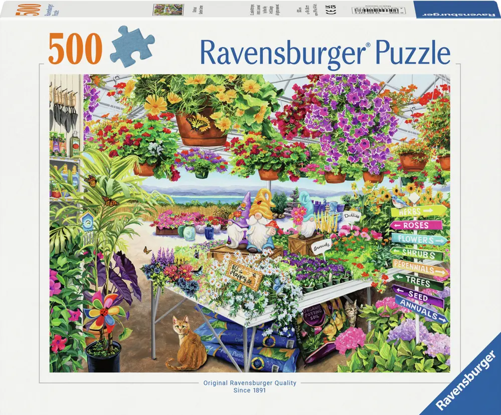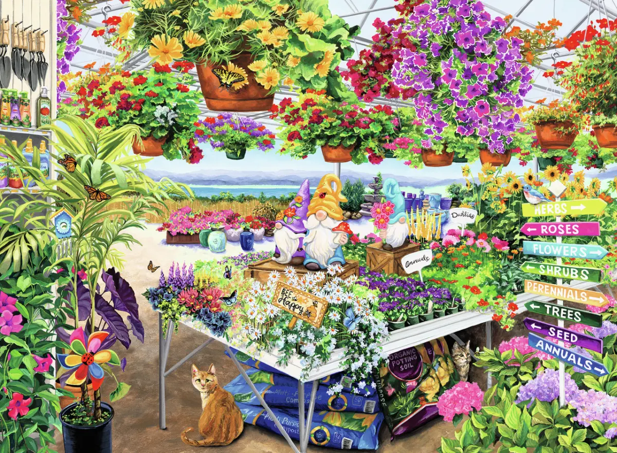 En färgsprakande trädgårdsbutik är full av blommor i olika färger. Här finns allt du behöver för trädgården både i form av växter, plantor, jord och redskap. Dessutom fina krukor och trädgårdstomtar! I den här miljön är det inte konstigt att katter, nyckelpigor och fjärilar trivs.
