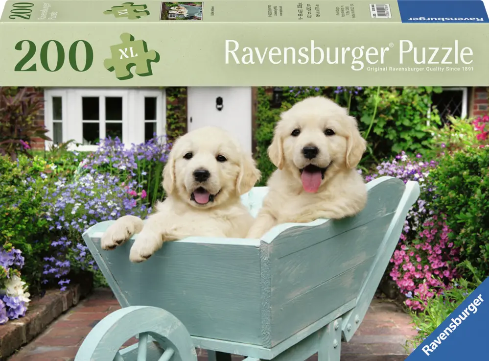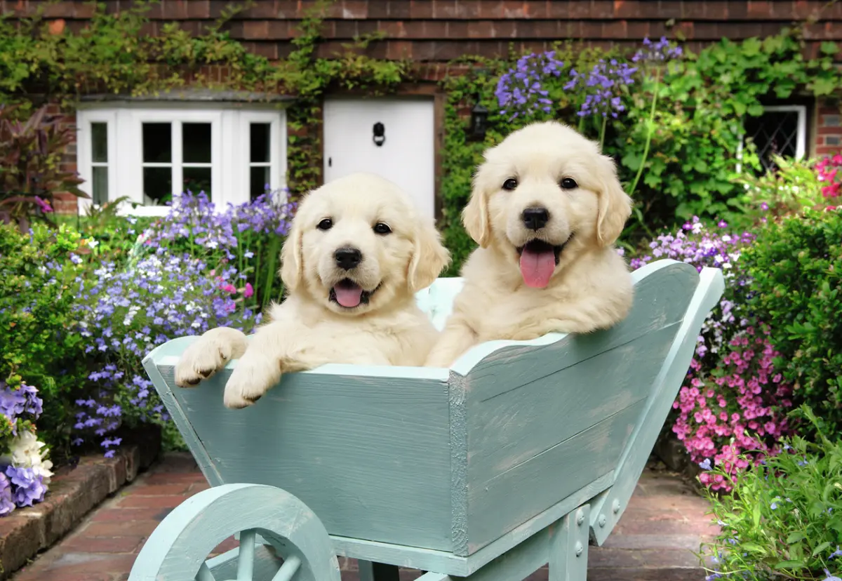 Två Golden retriever valpar sitter glatt i en skottkärra av trä. I bakgrunden skymtas ett hus och en trädgård full av rosa och lila blommor.