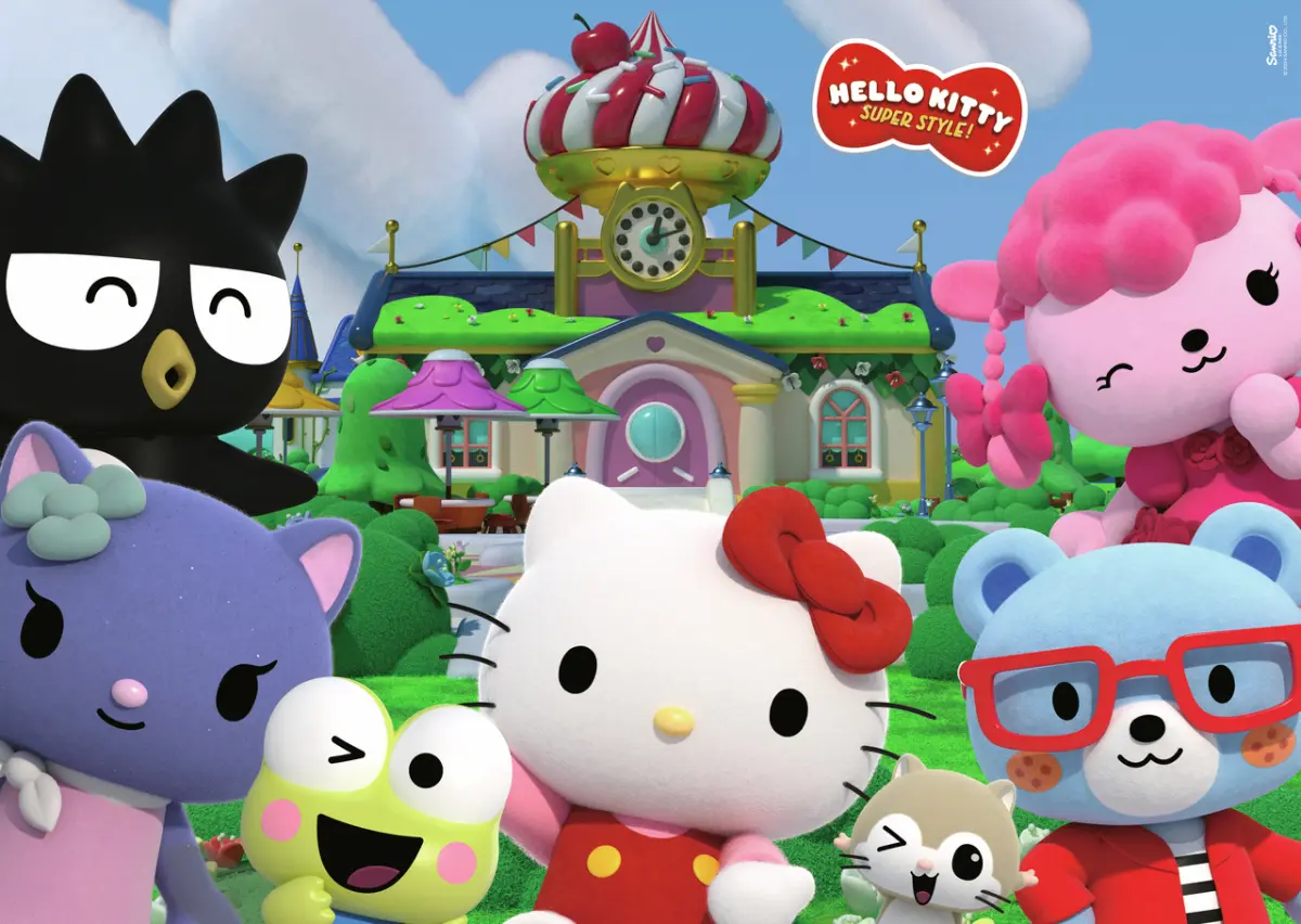 Ett stort pussel att lägga på golvet eller på ett bord, med motiv av Hello Kitty och hennes vänner.