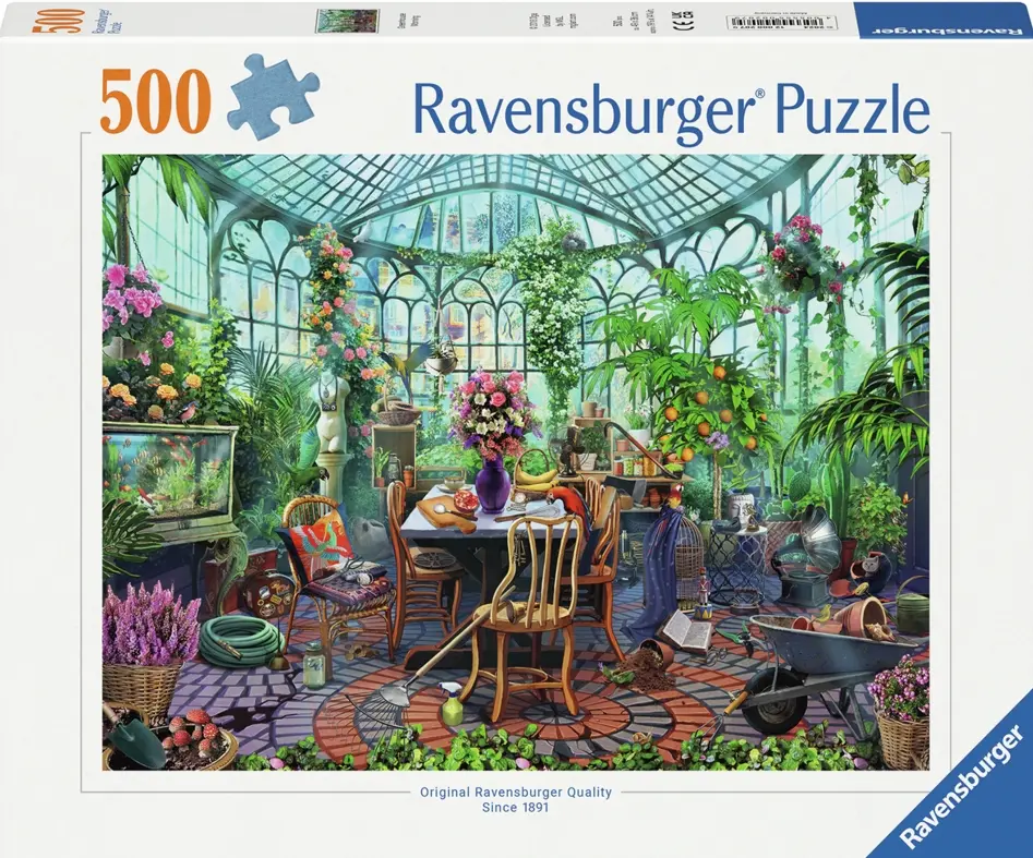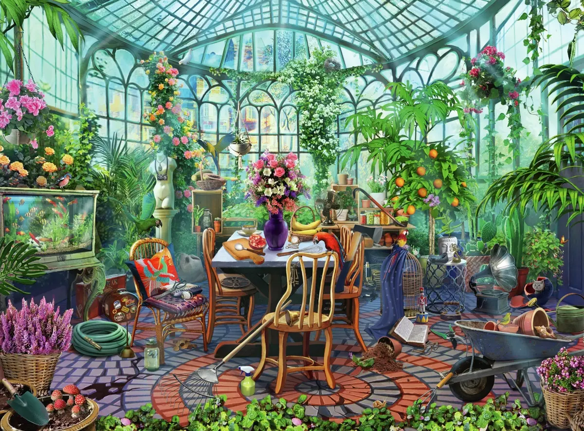 I ett stort vackert växthus frodas grönskan! Här finns ett bord och stolar att sitta på om man vill ha en lugn stund, och ett stort akvarium med olika fiskar att beundra. Bland rosor och apelsiner syns också papegojor, småfåglar, trädgårdsredskap och en liten grå katt som kikar fram ur en kruka. Ett rogivande motiv med mycket färg och detaljer.