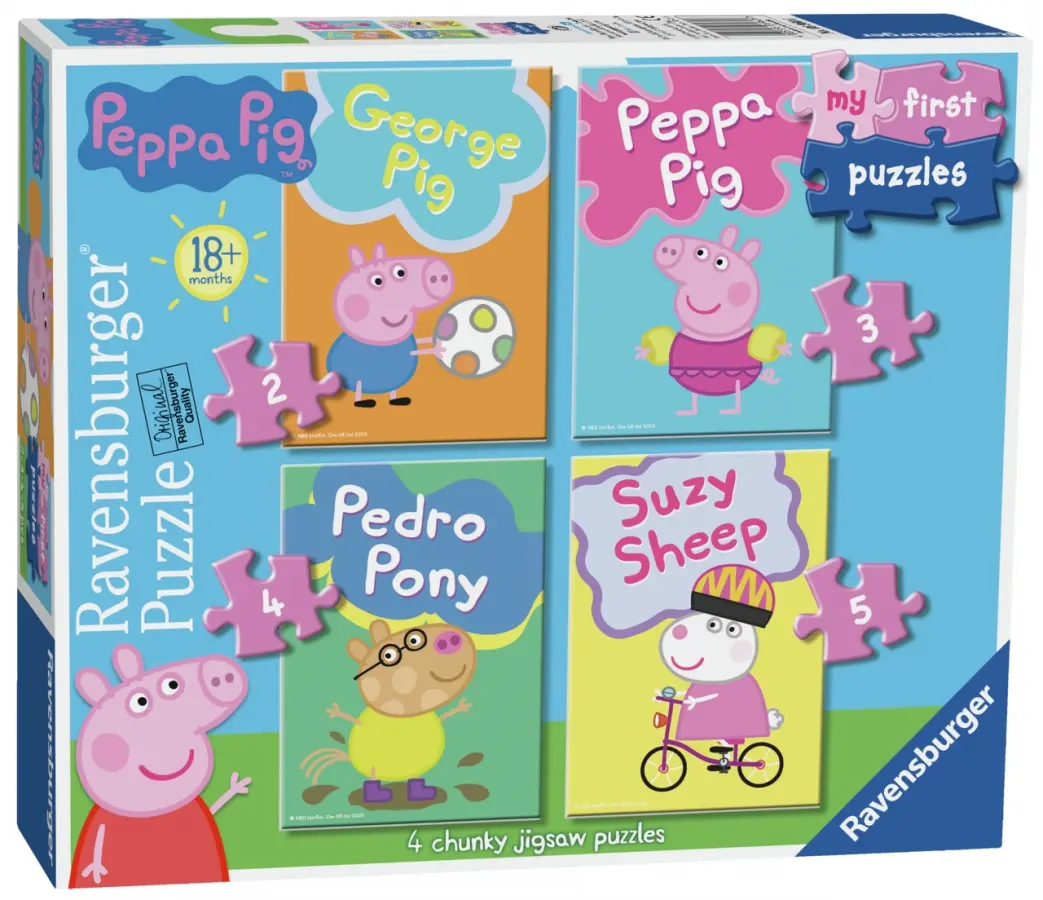 Fyra pussel på 2, 3, 4 och 5 bitar. Samtliga med olika motiv från den populära tecknade serien Greta Gris.