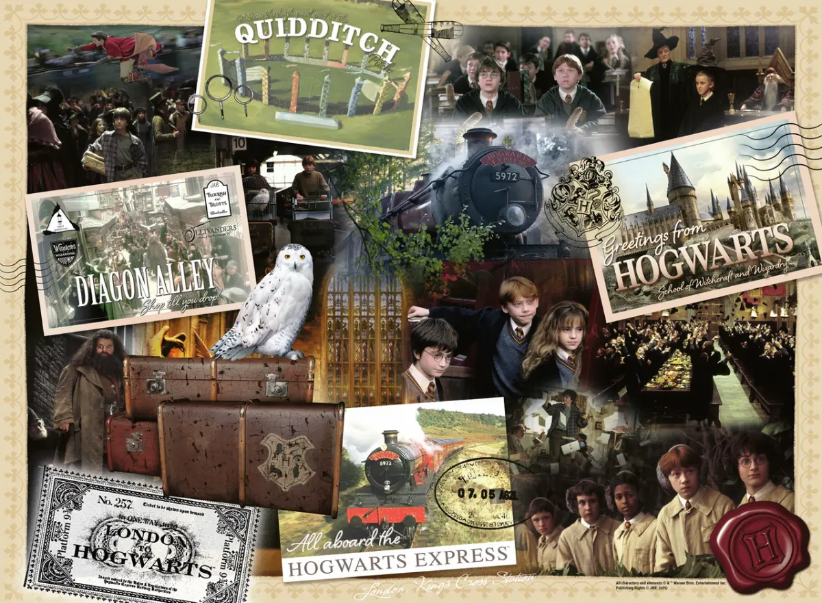 Ett pusselkollage av bilder ur de älskade filmerna om Harry Potter och hans vänner på Hogwarts.