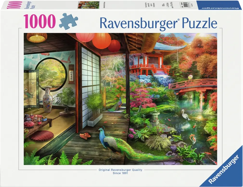 Vi blickar in i ett Japansk tehus där teet redan är upphällt i rykande koppar. Någon har tagit av sig skorna utanför där en påfågel också är på väg upp på träverandan.