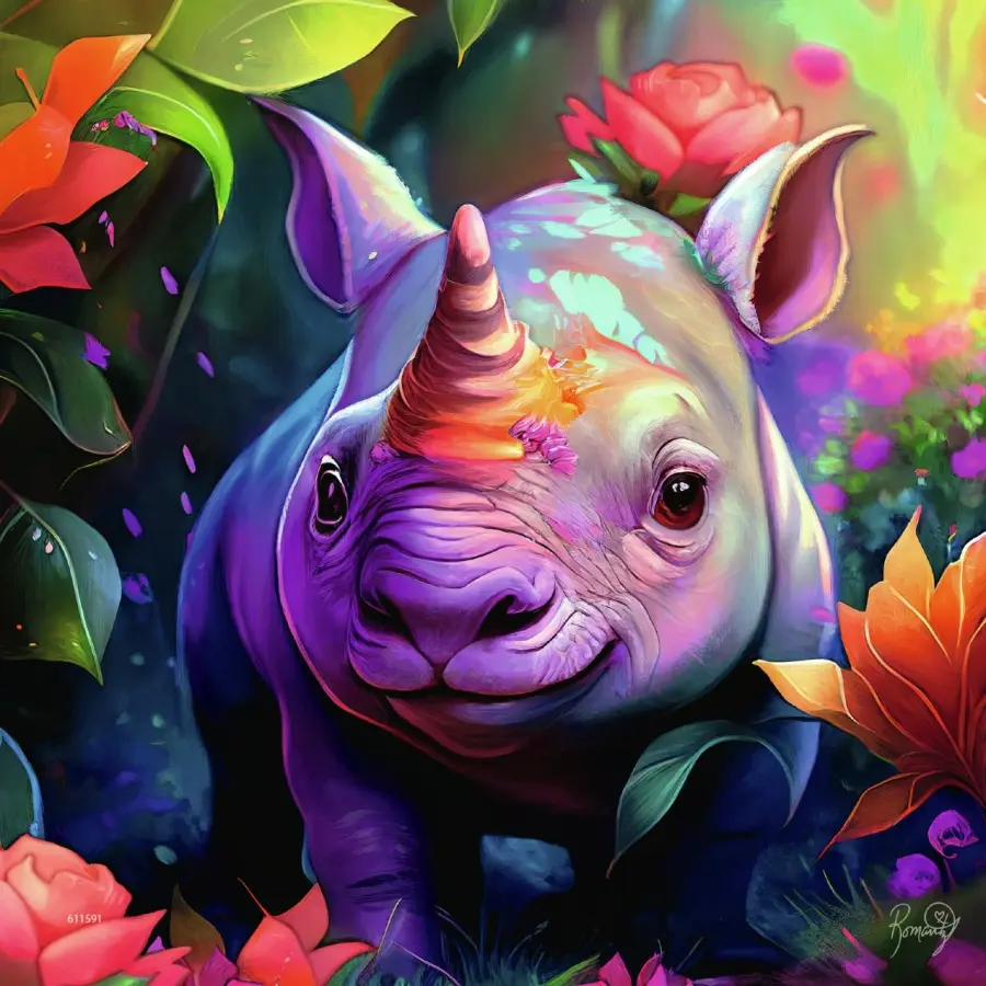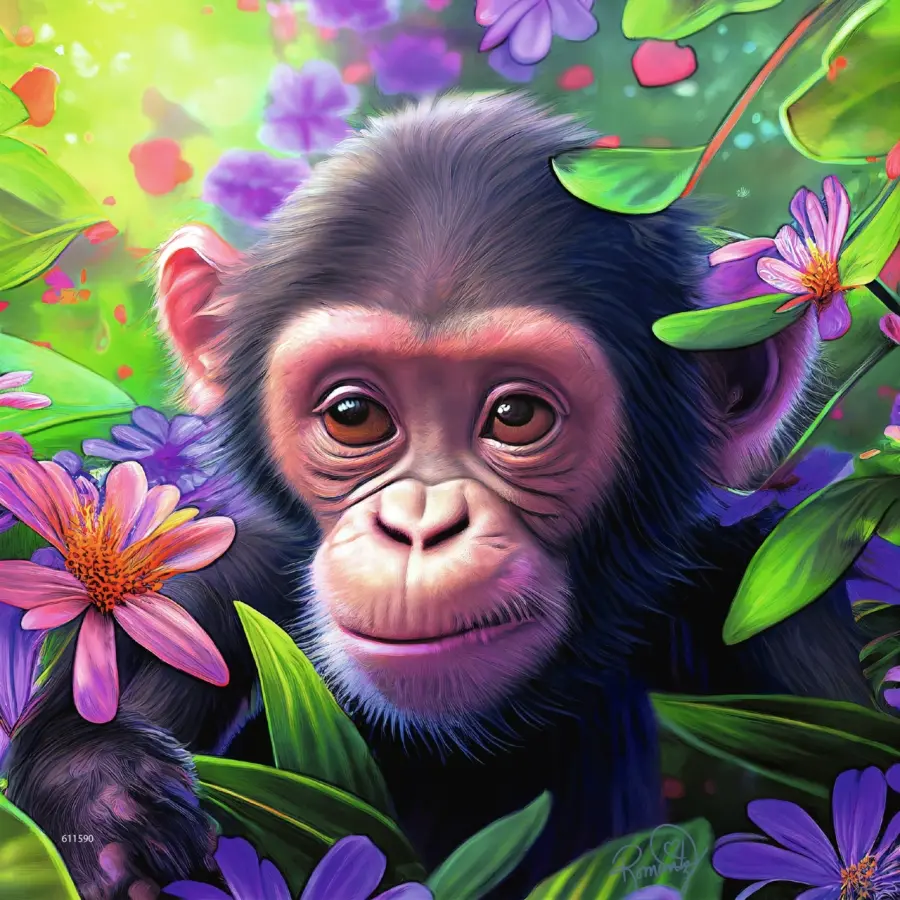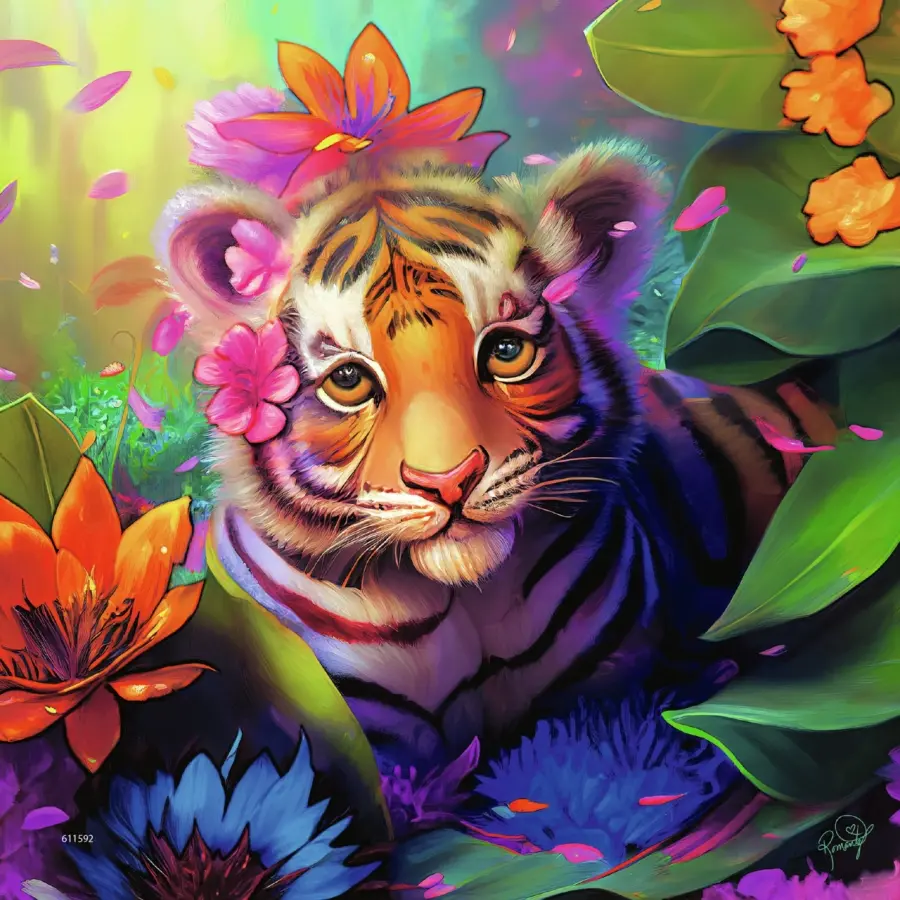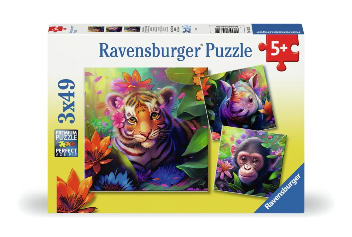 Tre pussel på 49 bitar vardera, med olika motiv av djungelns djurungar. Vi ser en tigerunge, en noshörningsunge och en liten chimpansunge. Alla tre sticker fram ur ett grönt bladverk och är omgivna av färggranna blommor.