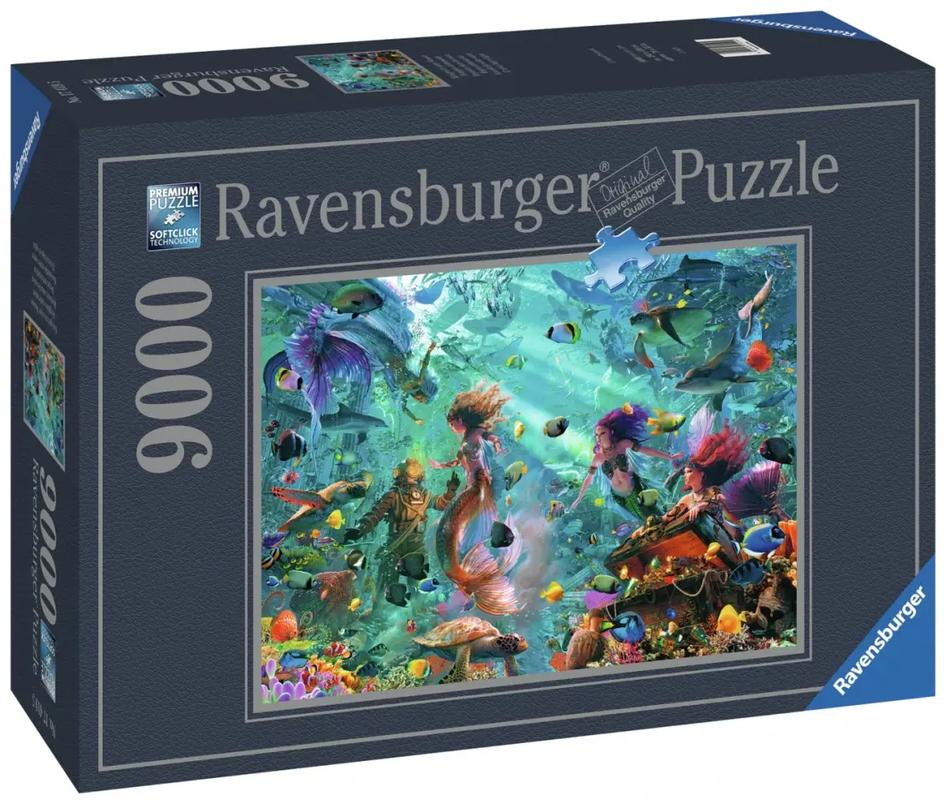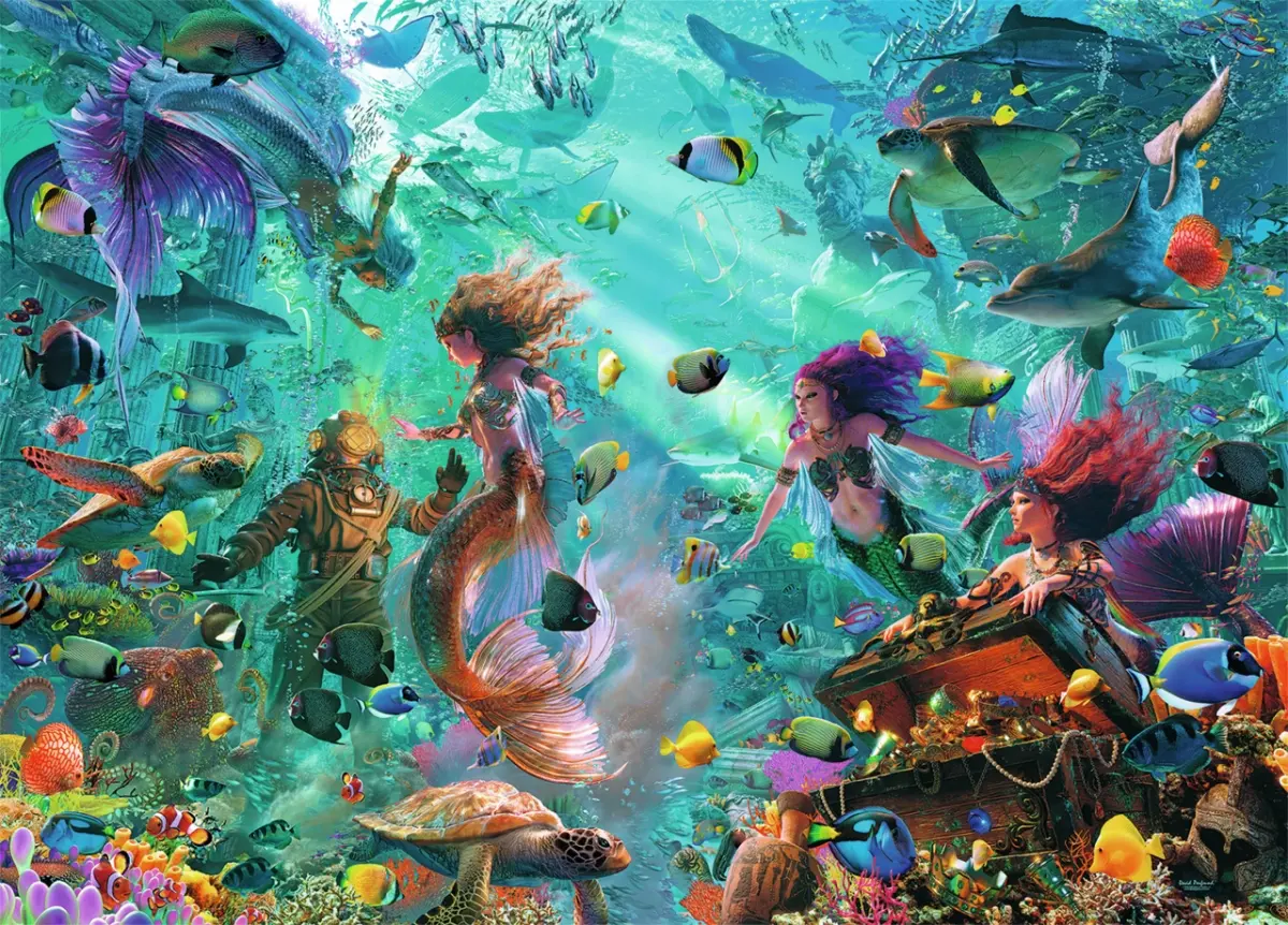 Här simmar sjöjungfrur bland havssköldpaddor, färgglada fiskar och korallrev. I bakgrunden syns resterna av ett palats med höga pelare, sjöjungfrurna vaktar en skatt full av guld och ädelstenar och uppe vid havsytan simmar valar. En dykare i gammaldags utrustning verkar vara på besök, idag får denne nog en upplevelse utöver det vanliga!