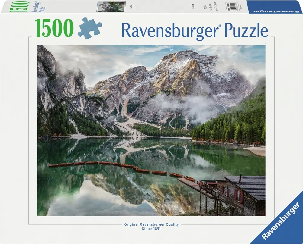 Sjön "Braies" ligger spegelblank denna dag i Prags Dolomiter i Sydtyrolen, Italien. I bakgrunden sticker höga bergskedjor upp mot en gråblå himmel. I motivet syns timmerstugor, skog och en rad roddbåtar är förtöjda vid en brygga.