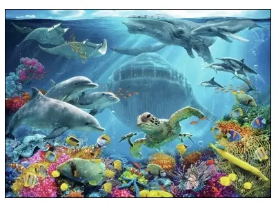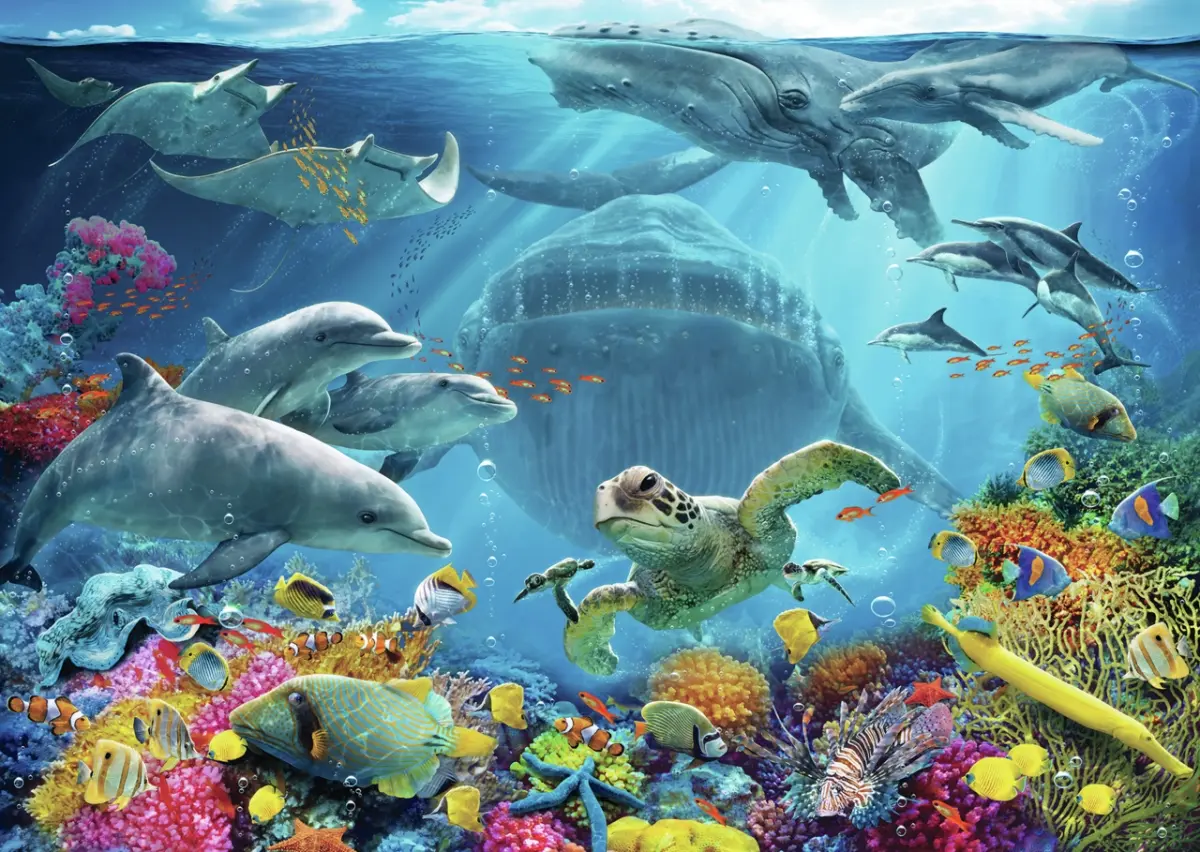 Ett hav fullt av liv med färgsprakande koraller, valar, rockor, delfiner och havssköldpaddor.