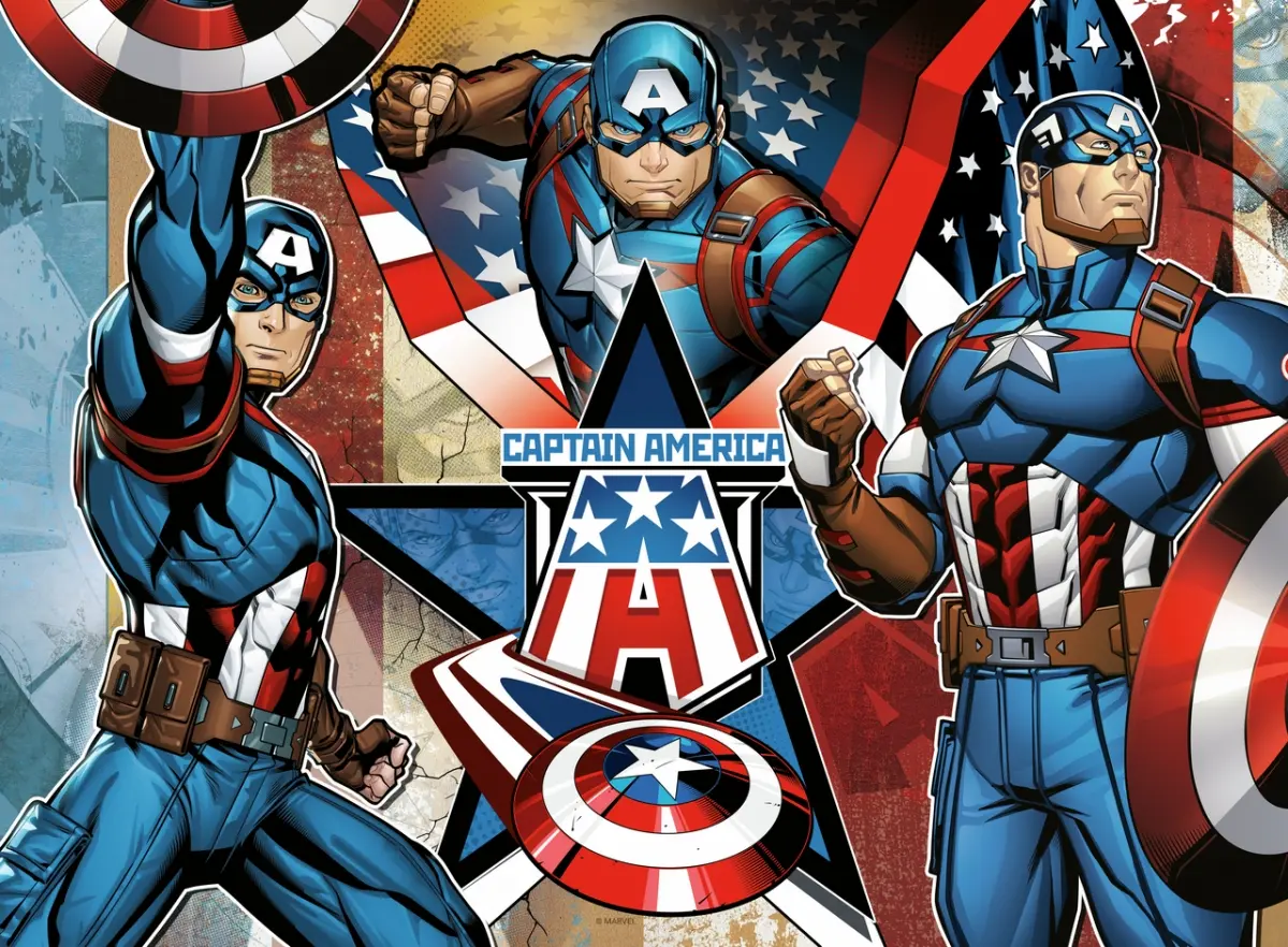 Ett fartfyllt kollage av superhjälten Capten America ur Marvel serien Avengers.