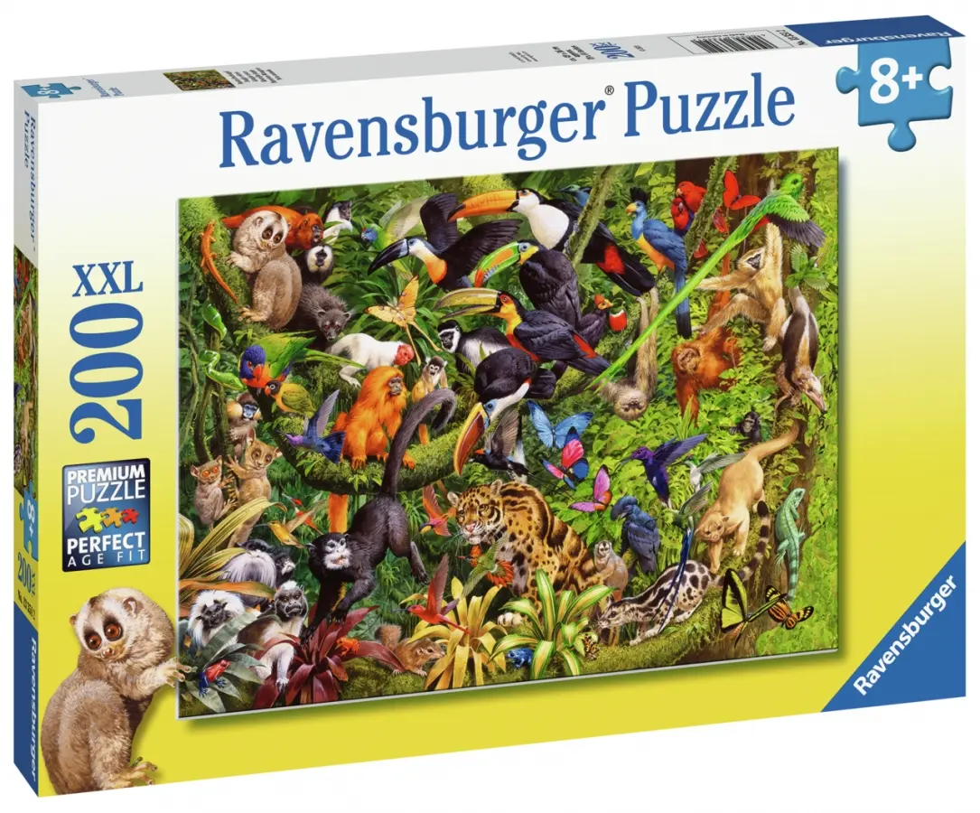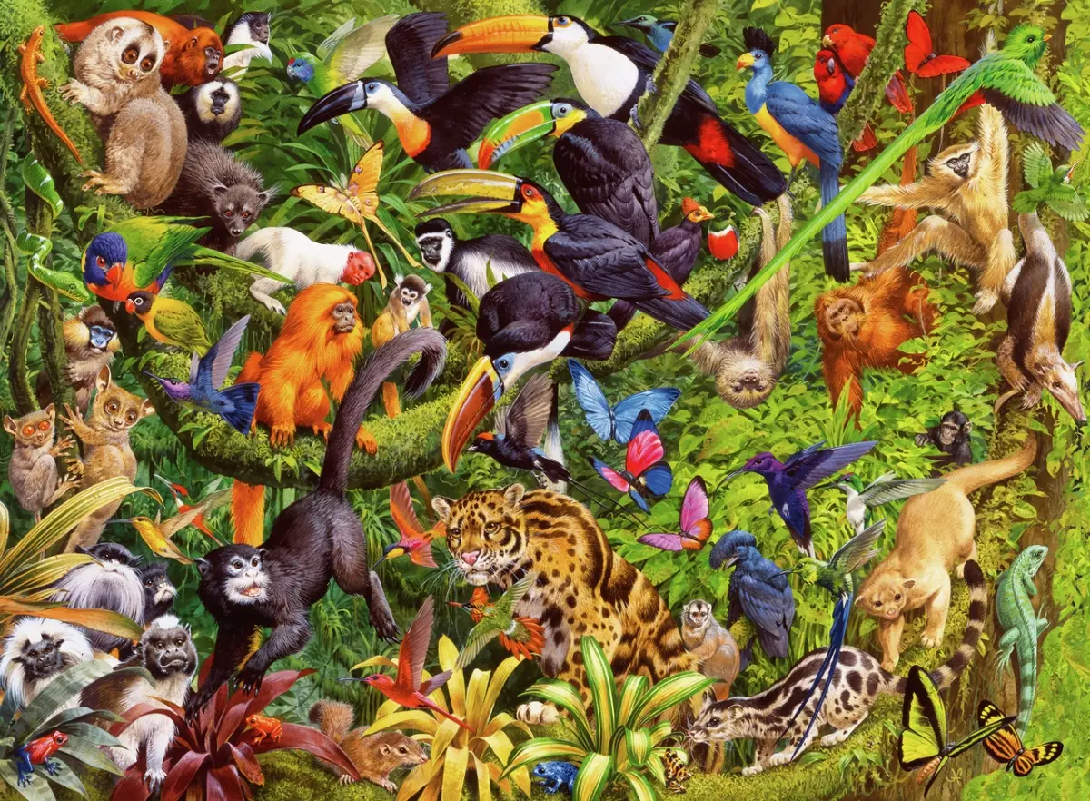 Ett fullspäckat motiv där regnskogens alla djur tycks ha samlats på en och samma gång.