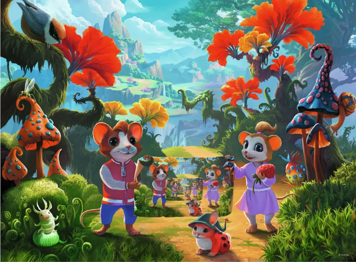 Musse & Helium i ett fantastiskt fantasilandskap med vacker tropisk natur, spännande djur och färgsprakande jättesvampar.